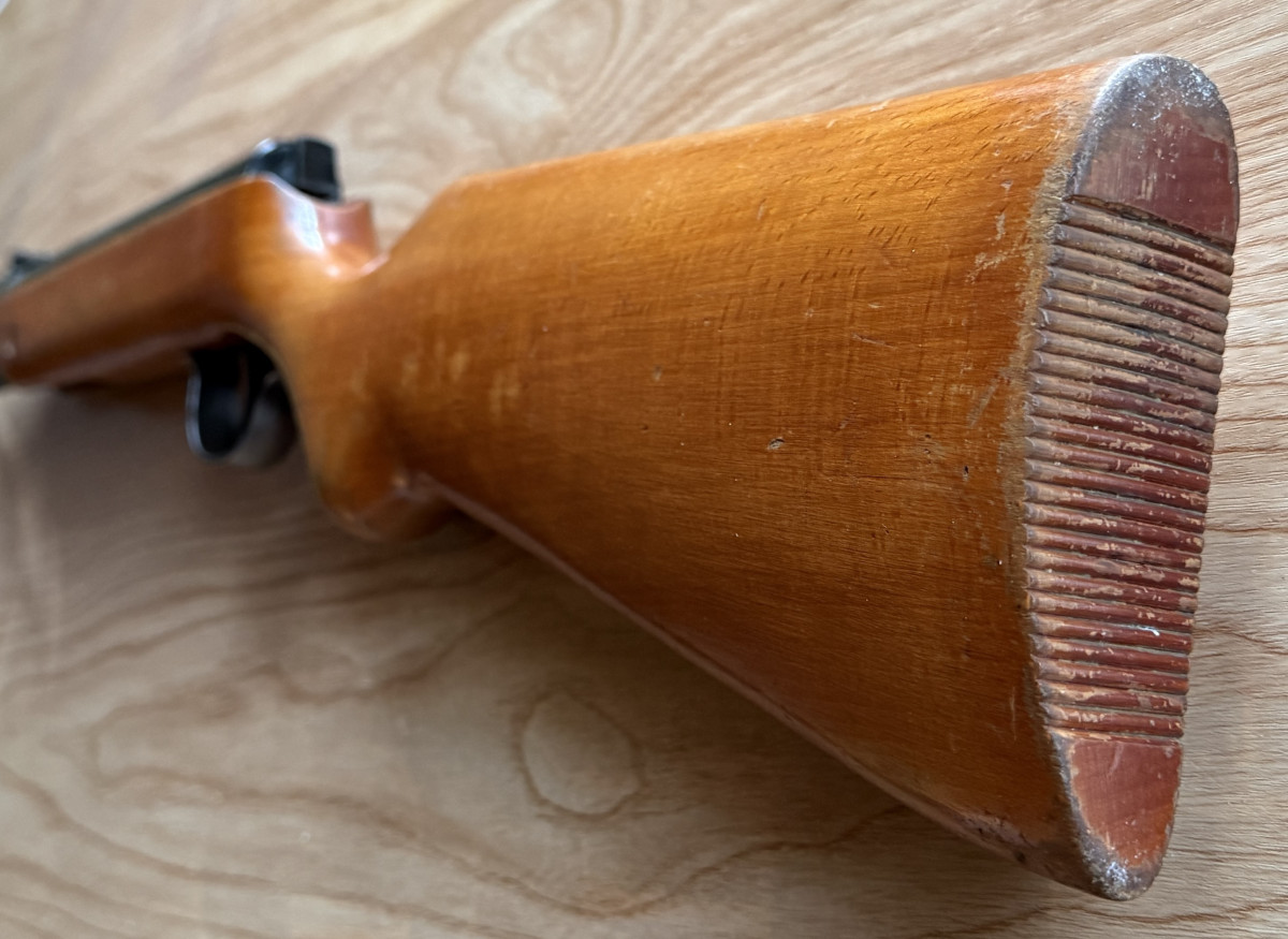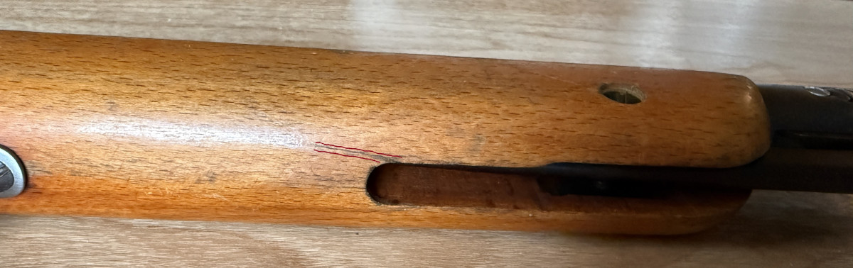 Im vorderen Bereich des Schaftes ist an einem Bild (rot markiert) ein kleiner Riss im Holz.