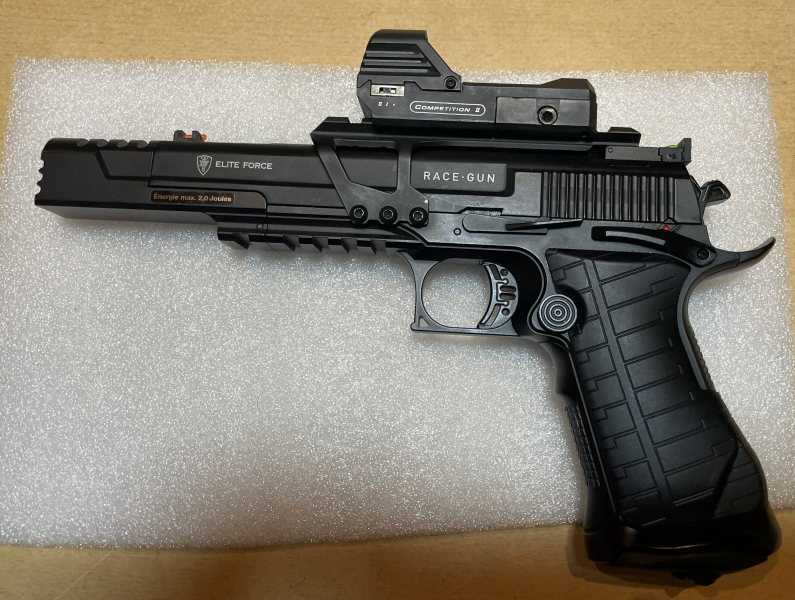 Die Race Gun CO2 Pistole im Set mit Walther Competition II Leuchtpunktzielgerät!