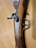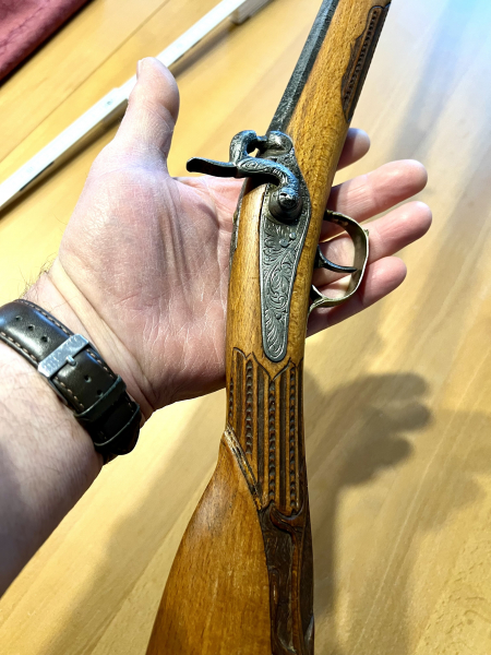 mit Muschelmotiv. Der Schaft ist aus Buche, mit einigen Wurmlöchern, aber sauber und wahrscheinlich geölt… Kein Lack drauf. Der Ladestock ist auch noch vorhanden, ebenso filigran wie die gesamte Flinte. Er hat wohl eine ältere Klebestelle, die aber fast unsichtbar ist , aber gut hält. Der Schaftabschluß am Kolben besteht aus einer Messingplatte? Bin mir nicht sicher…