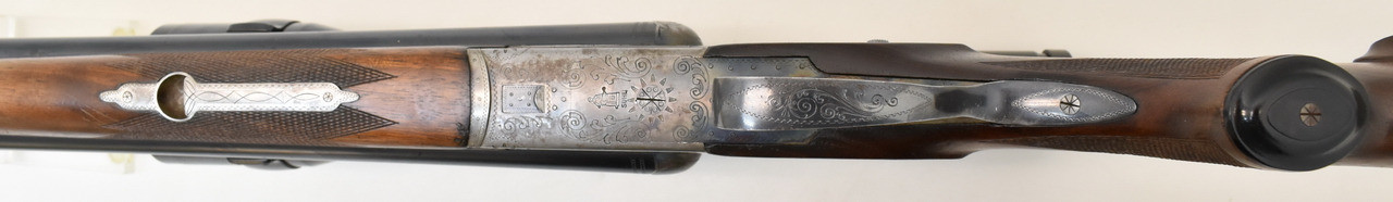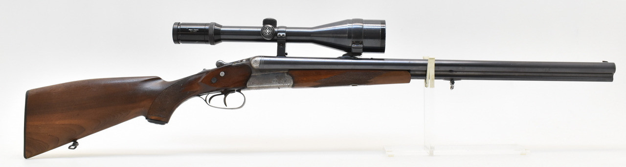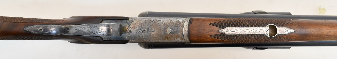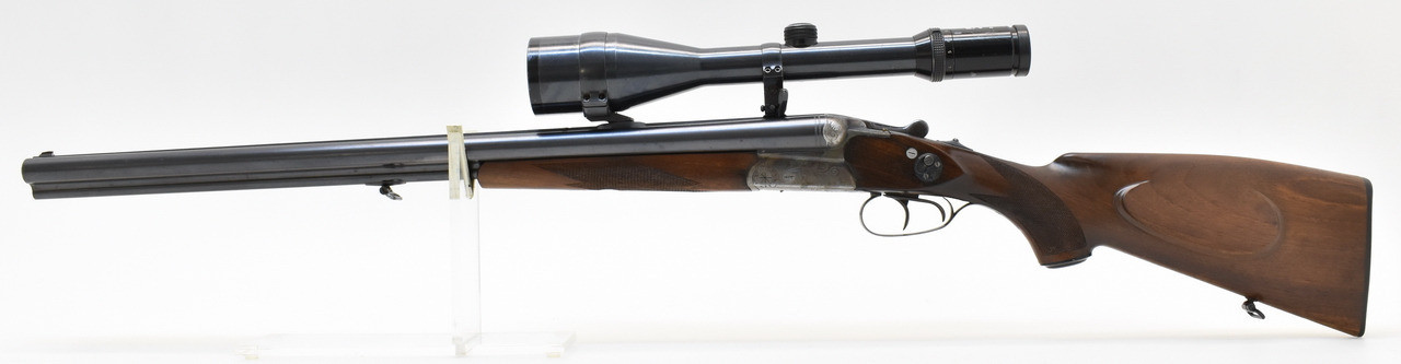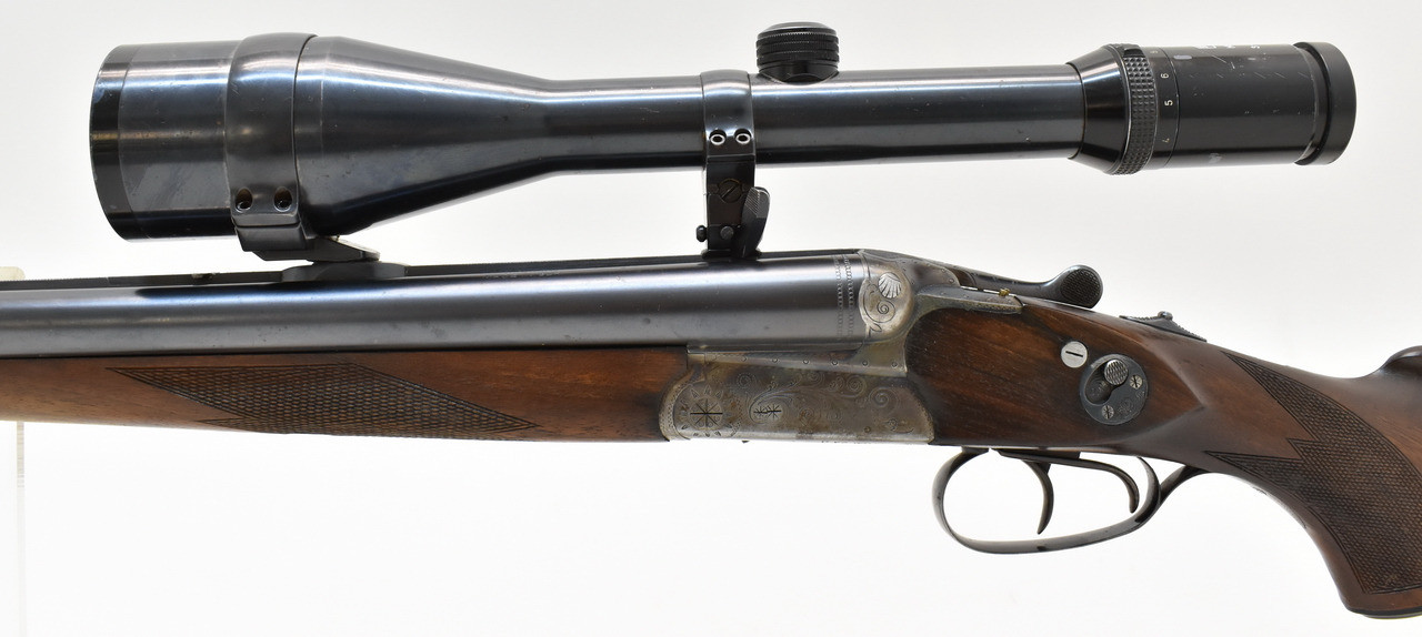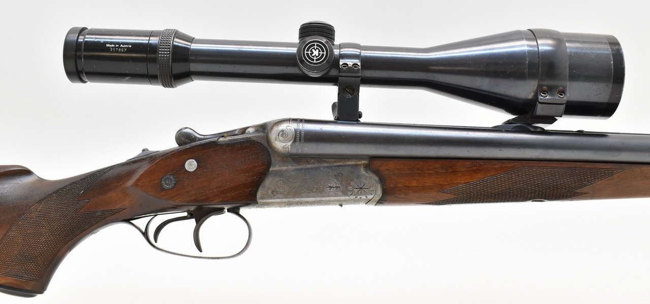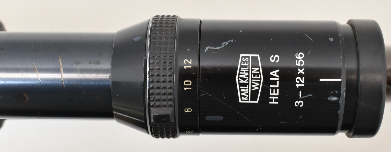 Stahlsystemkasten mit kleiner Gravur, französischer Rückstecher im vorderen Abzug. Läufe aus Special Gewehrlaufstahl, alle Läufe sind blank. Die Brünierung zeigt partiell kleine Rostnärbchen. Die Waffe ist mittels einer Schwenkmontage mit einem Kahles ZF Helia S 3-12x56 Abs. 1 montiert. Der Verschluss ist stramm, Beschuss von 12/1986 Schaftlänge 36,5cm gemessen vom vorderen Abzug bis Mitte Schaftkappe.