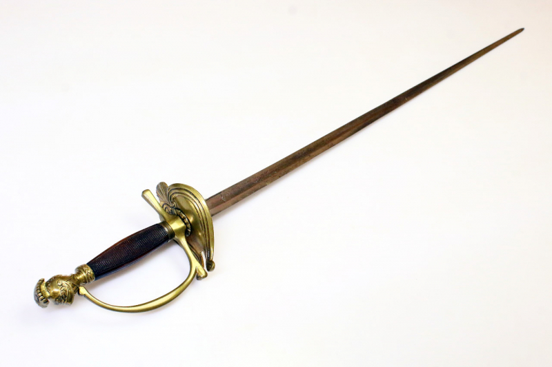 Messing-Bügelgefäß. Der Knauf das vollplastische Haupt eines Ritters mit Helm. Das Visier geschlossen. Die Oberseite des Stichblattes an den Kanten symmetrisch halbplastisch floral reliefiert. Die fein gewaffelte Griffhilze aus Edelholz. Der Griff sehr gut erhalten, Patina. Der Knauf etwas gelockert.