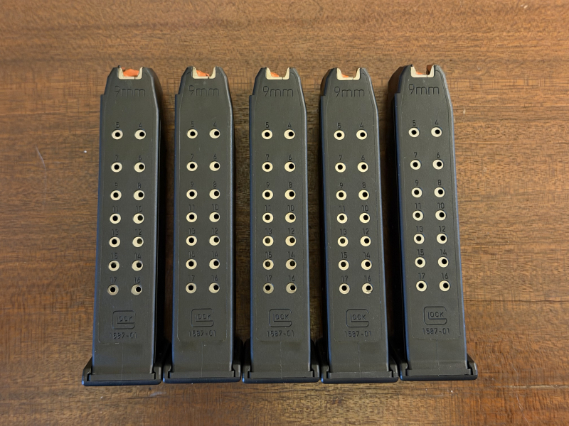 Verkaufe 5 original Glock Magazine (1587-01). Magazine sind für 9mm Munition und fassen 17 Schuss (ideal für IPSC). Magazin sollte in Glock 17, 17L, 34 und 19, 26, 49 passen. Ich selbst hatte sie in einer umgebauten Glock 22 (von 40SW auf 9mm umgebaut). Die Magazine sind fast wie neu und ohne Gebrauchsspuren. Da Privatverkauf: keine Garantie, keine Rücknahme, keine Gewährleistung.