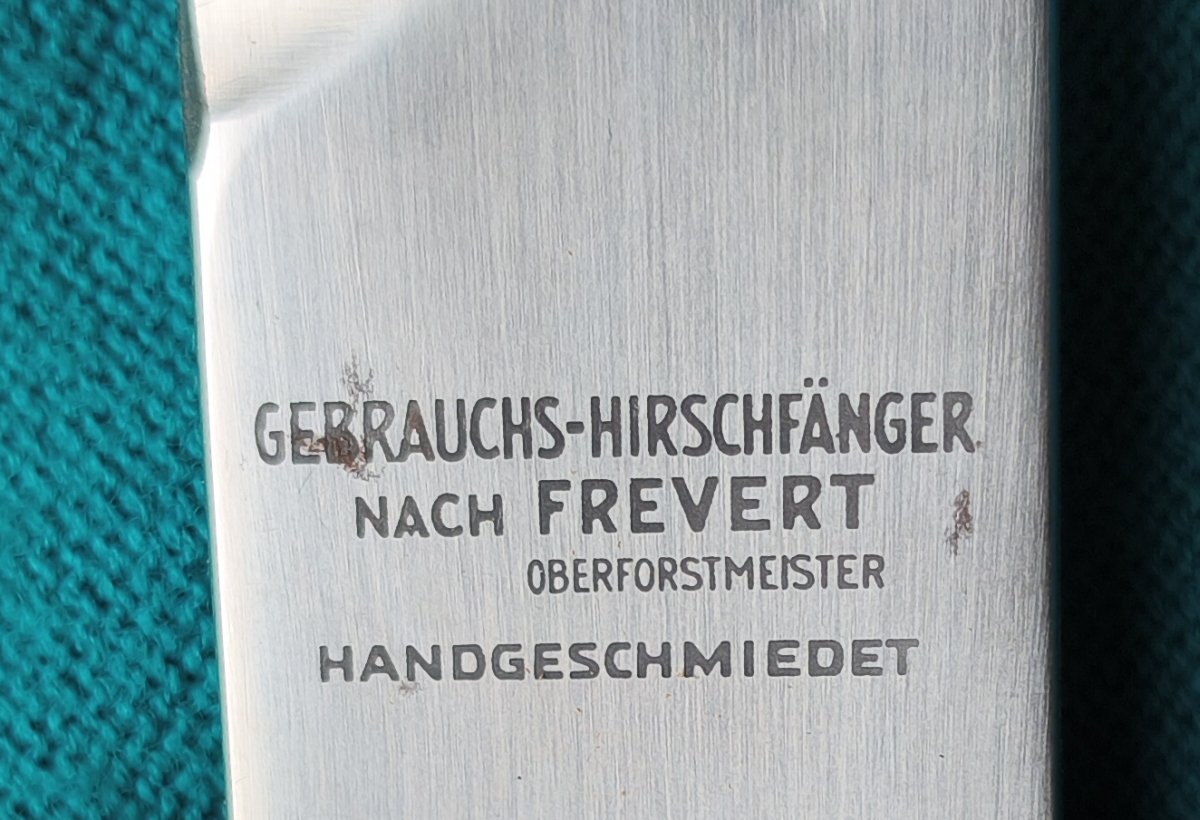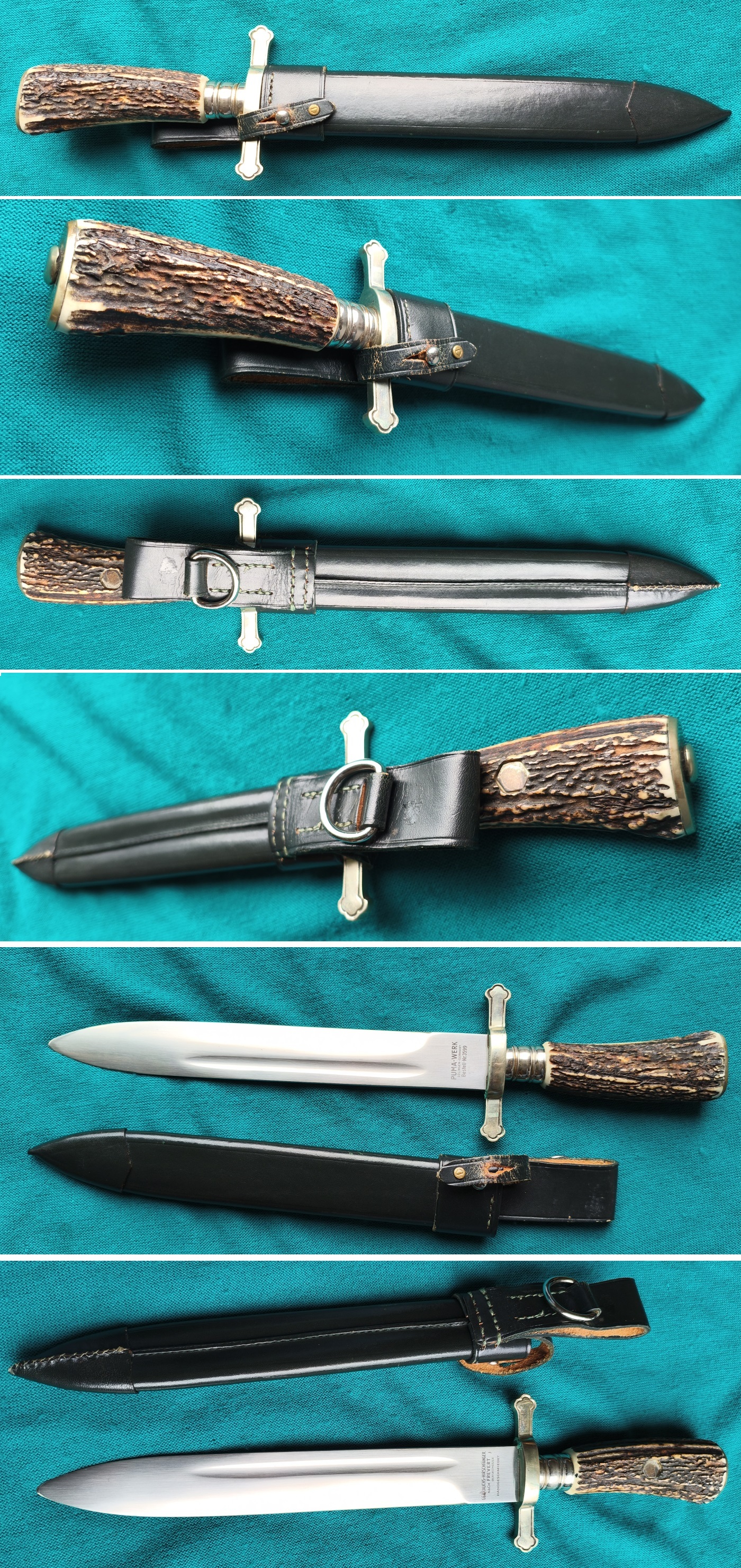 Blanke Klinge mit Inschrift, siehe Fotos. Gerades Parierelement, Nummeriert 83274. Hirschhorngriff mit Zwinge. Monogrammplatte 800. Kopfplatte, originale Vernietung. Grüne Lederscheide mit Anhängung und Schlaufe. Gesamtlänge mit Scheide 39,3cm.