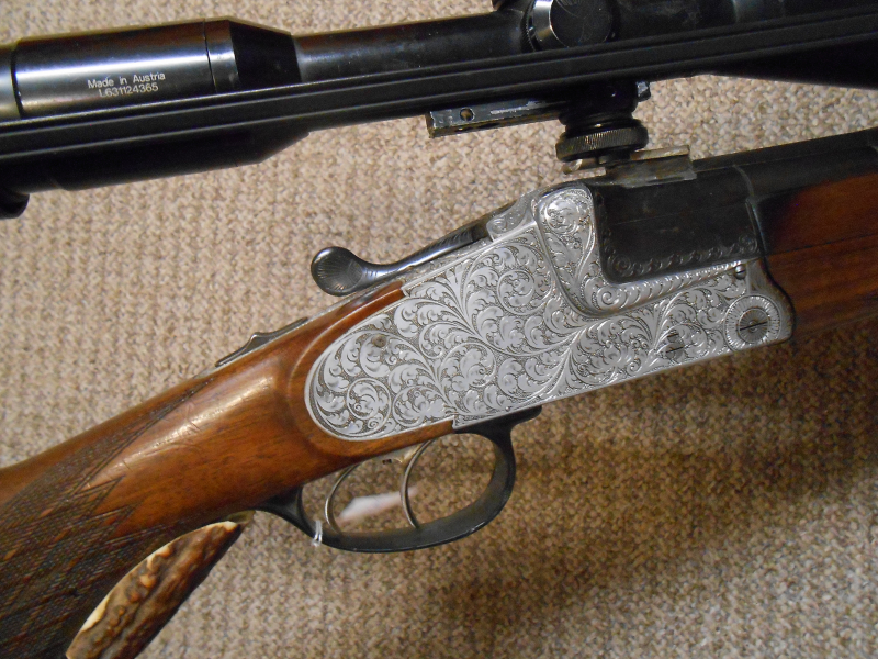 Bockbüchsflinte Krieghoff / Ulm. Lange von Hand gravierte Seitenplatten. Kal 16/70 7x57R, blanke Läufe, SM mit Swarovski Habicht 8x56 mit LA 4.