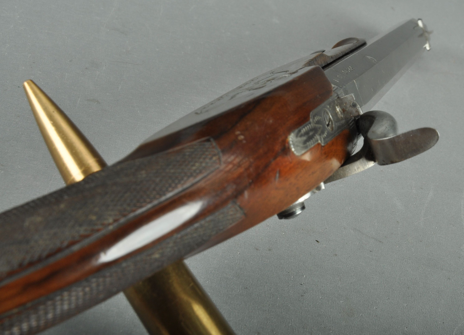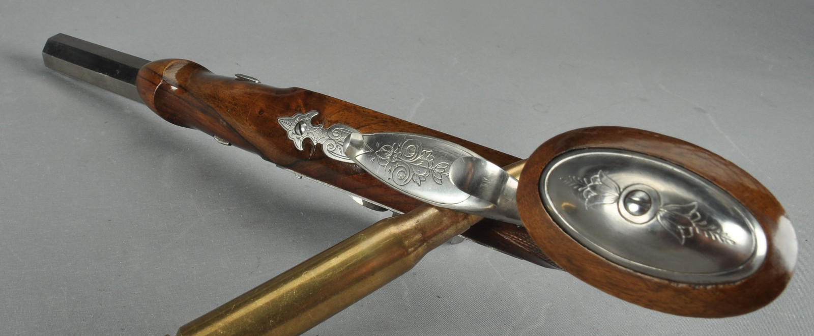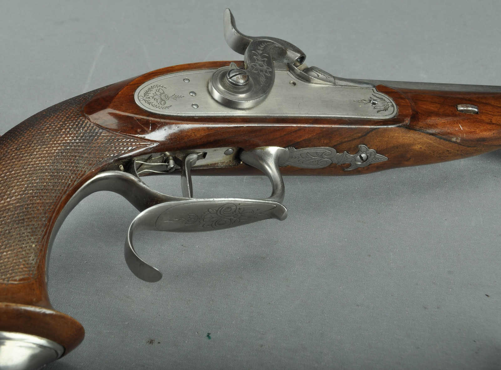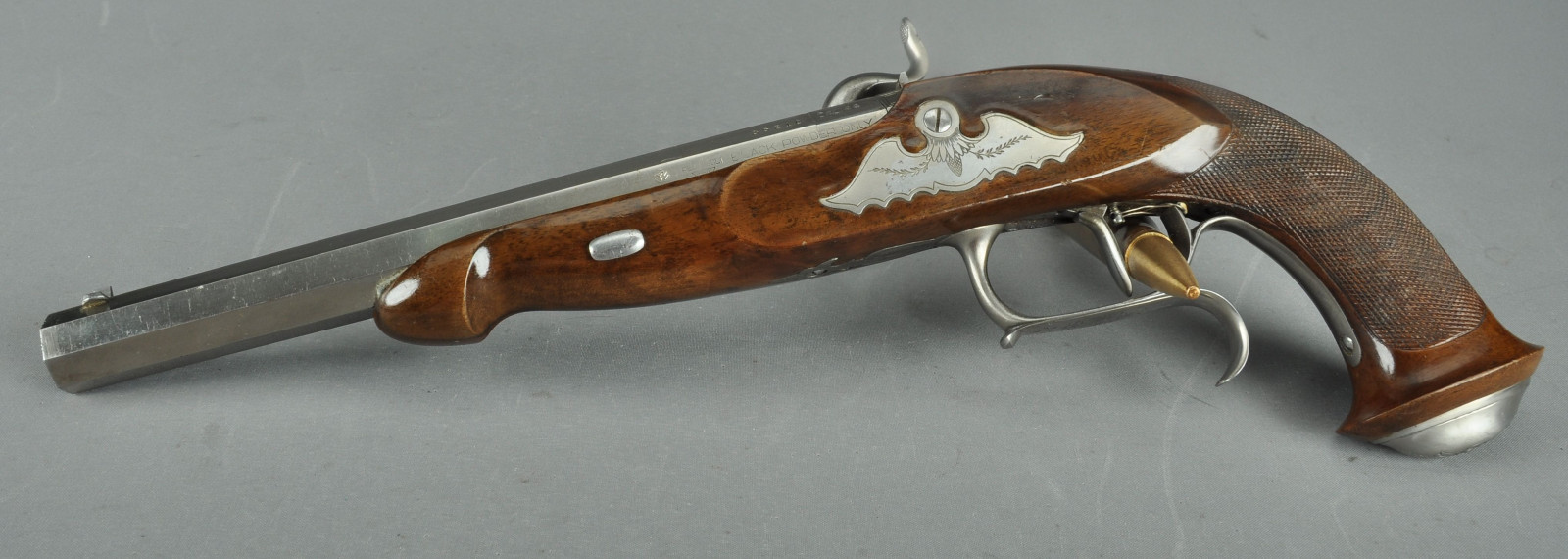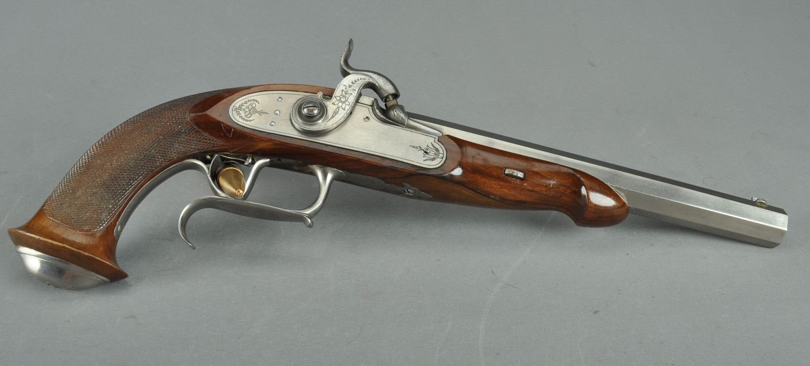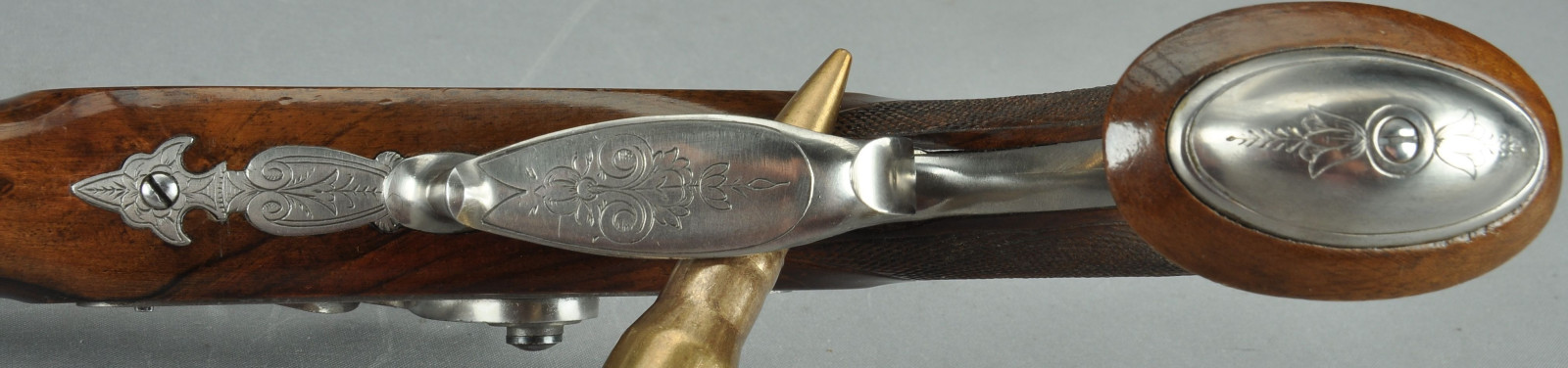 Wohl bekanntester Nachbau des Originals von Jean le Page, einem der einflussreichsten Büchsenmacher Frankreichs Ende des 18. Jahrhunderts. Saubere Reproduktion mit fein einstellbarem Stecher und höhenverstellbarem Visier. Lauf, Schloss und Beschlagteile blank belassen. Walnussschaft in Ölfinish mit Fischhaut.