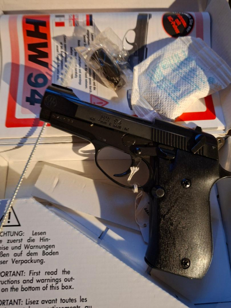 Ich biete eine neue Pistole Weihrauch HW 94 in schwarz, diese Pistole wird nicht mehr produziert. Das Besondere ist das diese Pistole Revolverkartuschen in .9mm RK geschossen wird. Daher hat diese eine wesendlich bessere Wirkung und stärkeren Knall als jeder Revolver im .9mm RK. Weiterhin ist sie in einer exzellenten Qualität der Firma Weihrauch produziert worden. Inhalt HW 94 mit -1- originalen Magazin, OVP mit Bedienungsanleitung, Bürste sowie Abschussbecher und Staubschutzschraube für die Mündung. Sie wurde nur zur Probe geschossen.