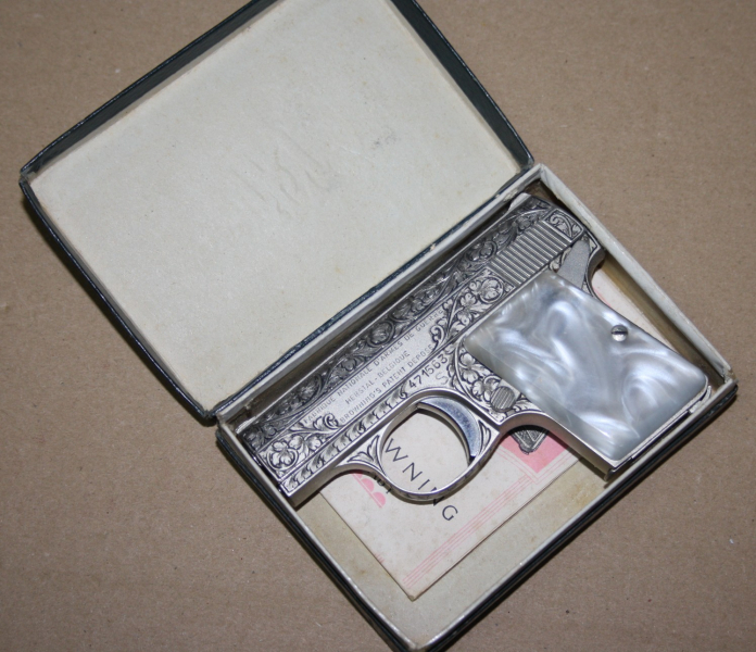 Aus einer großen Sammlung kommt hier diese voll gravierte FN Baby im Kal. 6,35mm Br. zur Auktion. Dieses Sondermodell ist im absolut neuwertigen Zustand. Lauf und Funktion natürlich einwandfrei. Kommt in der OVP wie abgebildet.