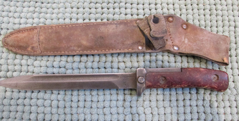 Bajonett mit Lederscheide Bakelit Griffschalen , Nummer auf der Klinge , Drücker funktioniert, Gesammtlänge 29 cm. Lederscheide stärker gebraucht.