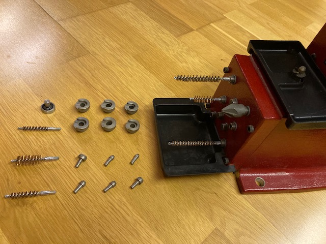 Bürsten zum Reinigen der Hülsenhälse sind einige beigefügt, Führungsdorne für die Kaliber .22, .25 / 6mm, .270 / 7mm, .30 und .45 ebenfalls.