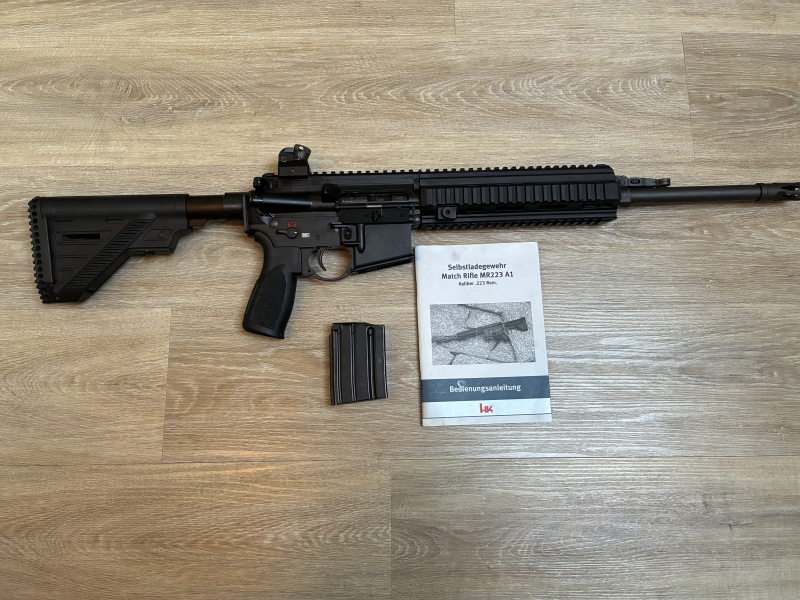 Sie bieten auf eine gebrauchte Heckler&Koch MR223 A3 im Kaliber .223Rem. mit 16,5“ Lauflänge und einem 10 Schuss Magazin, wie auf den Bildern zu sehen ist. Die Selbstladebüchse wurde von mir 2015 neu erworben. Zur Schussbelastung, ca.3500 Schuss. Der Lauf ist rostfrei und spiegelblank. Die Büchse ist für das Alter im sehr gutem Zustand, lediglich an der Ober-Unterseite der Rail sind oberflächige Gebrauchsspuren vorhanden-siehe Bilder. Privatverkauf, keine Garantie oder Gewährleistung, keine Rücknahme. Verkauf nur an Erwerbsberächtigte innerhalb Deutschlands.