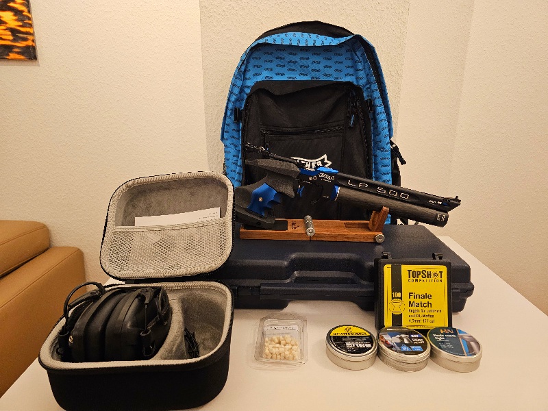 Es handelt sich um die Walther LP 500 Meistermanufaktur mit blauen Akzenten, mechanischem Abzug und Carbon Kartusche (Haltbarkeitsdatum 11/33, jetzt nur noch mit Alu-Kartusche lieferbar). Außerdem gebe ich den passenden Walther Rucksack, einen LP Fix Ständer mit eingelasertem Walther Logo, aktiver Gehörschutz mit Verstärker, der Schüsse blitzschnell dämpft, mit. Desweiteren ist noch diverse Munition, Reinigungsstopfen und eine Schüttelbox dabei, sowie das Einstelltool von Walther.