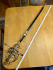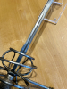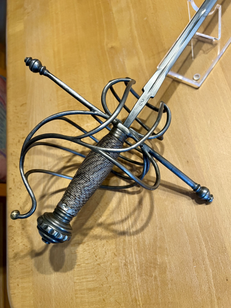 Elegantes Stoß-Rapier mit scharfer und spitzer Klinge Achtung : Dieses Rapier ist kein Spielzeug, sondern spitz und relativ scharf, eine echte Waffe. Elastische Klinge mit 2 Schneiden , einer Nummer (2) und so etwas wie eine Schmiedemarke. Der Korb und das Parier sind aus filigranem Stahl, mit Zierabschlüssen. Siehe Fotos. Gesamtlänge mit Scheide ca. 110cm. Am Korb ist eine Reparaturstelle zu sehen, die sicherlich verbessert werden kann. Der Klingenquerschnitt ist rautenförmig. Die mit Draht umwickelte Griffhilze aus Holz ist etwas locker, aber das man ja auch verbessern. Unten am Griffende befindet sich etwas Zinnlot auf der Drahtwicklung, sieht nicht so schön aus, eben auch verbesserungswürdig. Ist halt aus einem Nachlass aber noch sehr akzeptabel. Der Pommel ist massiv, wohl aus Stahl oder Eisen,schön gestaltet und mit dem Erl vernietet. Die Scheide ist nicht original sondern dient nur als Transportschutz. Ausserdem ist sie wohl aus einer militärischen und einer zivilen zusammengestrickt. Funktioniert aber und erfüllt ihren Zweck. Da ich nicht weiß, wie alt das Rapier ist, stelle ich es nicht als Historisches Original ein, ich vermute , es wurde irgendwann Mitte der 1900er Jahre gefertigt. Klinge vermutlich aus altem Solinger Bestand. Eventuell hat ein erfahrener Egner ja eine Idee, bin für jeden Hinweis dankbar. Privatverkauf!u Keine Garantie oder Rücknahme, Verkauf nur an Erwachsene. Bitte Scan des gültigen Personalausweises / Vorder - und Rückseite an mich. Bieter mit 0 Bewertungen oder Sonnenbrille bitte vorher Kontakt mit mir aufnehmen. Mich interessiert nur der Name, Wohnort und das Alter. Alles andere kann abgedeckt werden. Diese Scans werden sofort nach Sichtung gelöscht. Fragen bitte vor Abgabe eines Gebotes. ________________