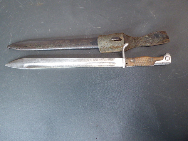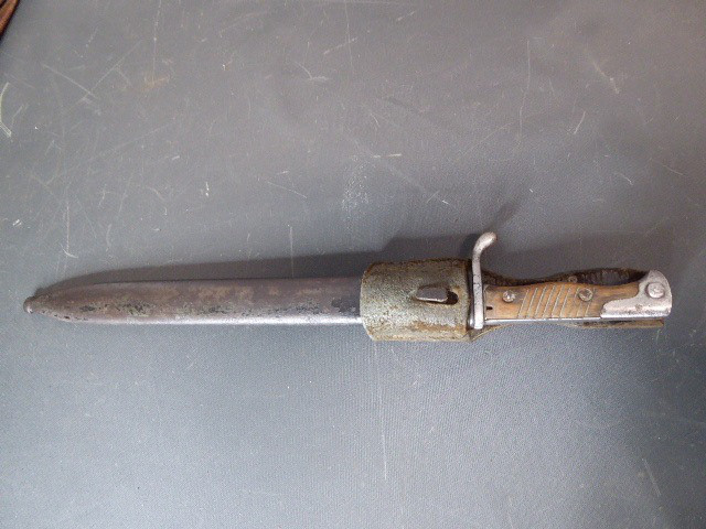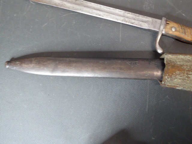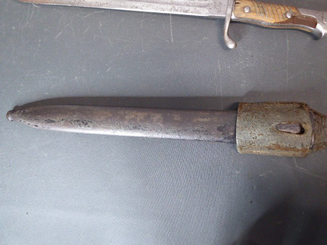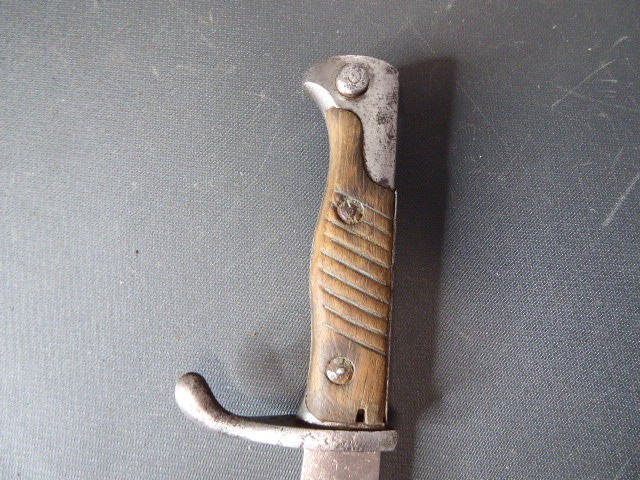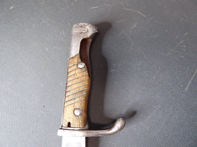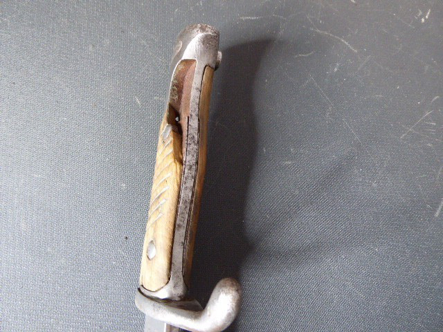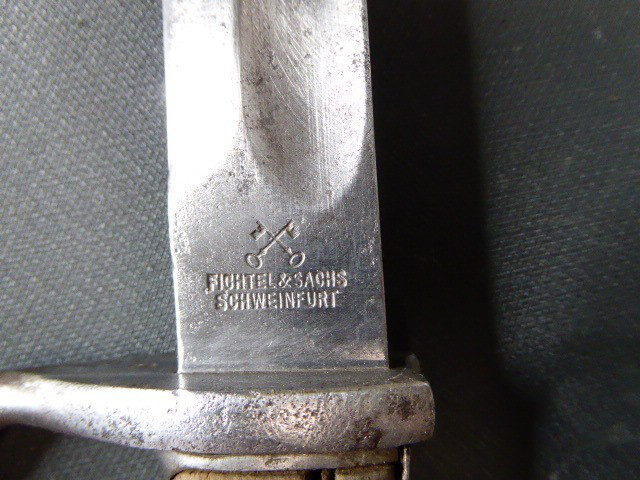 Aus meiner Sammlung gebe ich, ein altes 98/05 Bajo mit Scheide Trageschuh Hersteller FISCHTEL & SACHS SCHWEINFURT ab. Griff zwei Holzschalen eine Schale mit Ausbruch. Griffknauf und Parierung mit Punzen. Klinge mit Hersteller, Rücken gestempelt 17 unter L und Krone darunter Abnahme Punze, mit dazugehörigen Trageschuh aus Leder. Das Teil ist im Sammelwürdigen Zustand. Alles andere entnehmen Sie Bitte den Fotos. Gesamtlänge: 52 cm, ohne Scheide: 50 cm, Klingenlänge: 36,5 cm, Klingenbreite: 2,6 - 3,4 cm. Kann zu jederzeit bei mir besichtigt werden. Privatauktion keine Rücknahme und Garantie.