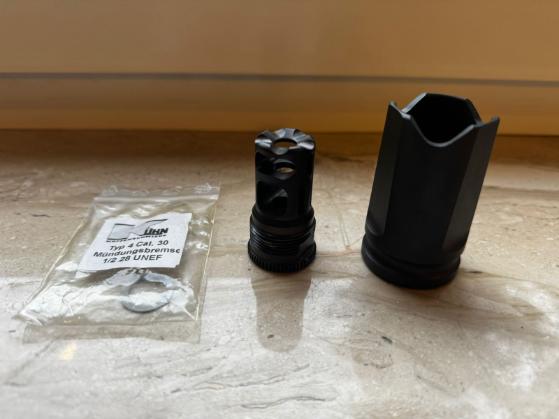 Zum Verkauf steht eine hochwertige Mündungsbremse Typ 4 des Büchsenmachers Kühn, passend für Kaliber .30 und mit dem Gewinde 1/2" x 28 UNEF.
