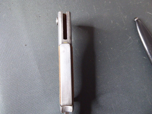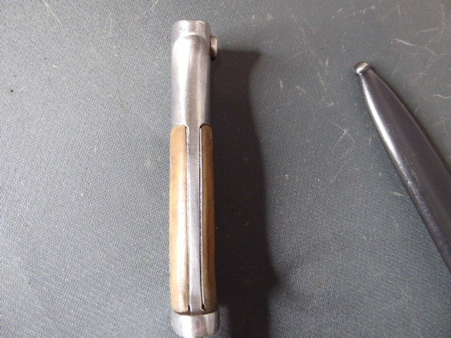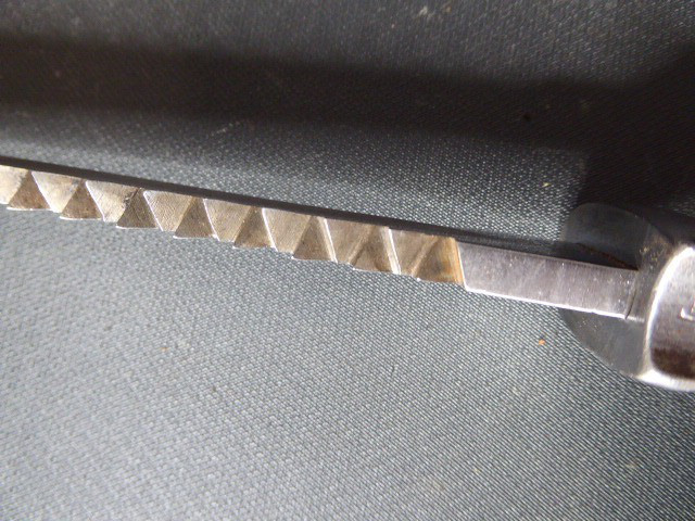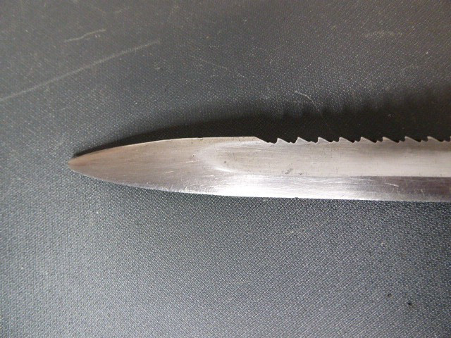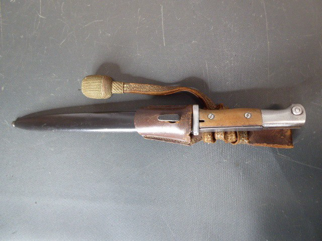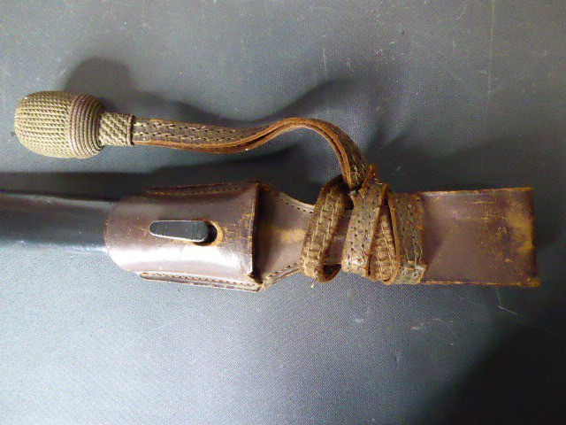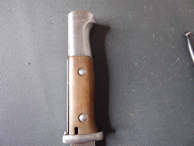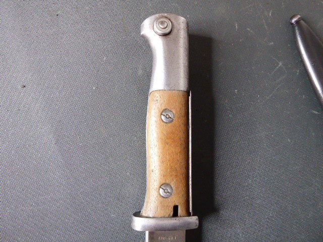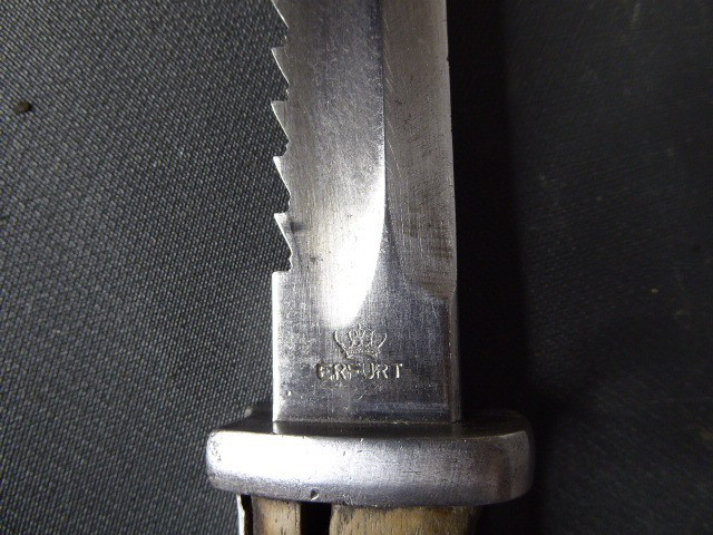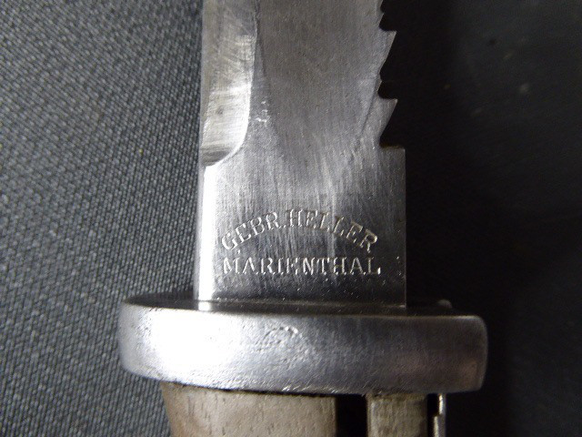 Aus meiner Sammlung gebe ich, ein 94/98 Bajo Sägerücken Trageschuh Portepee Herst. GEBR. HELLER MARIENTHAL und noch ein Hersteller ab. Griff zwei Holzschalen. Griffknauf mit Punze, im Laufring noch F gestempelt. Klinge mit Sägerücken ohne Punze. Doppelhersteller, GEBR. HELLER MARIENTHAL andere Seite ERFURT unter KRONE. mit dazugehörigen Trageschuh aus Leder und das dazugehörige Portepee. Das Teil ist im Guten Sammelwürdigen Zustand. Alles andere entnehmen Sie Bitte den Fotos. Gesamtlänge: 40,6 cm, ohne Scheide: 38,1 cm, Klingenlänge: 24,7 cm, Klingenbreite: 2,5 cm. Kann zu jederzeit bei mir besichtigt werden. Privatauktion keine Rücknahme und Garantie.