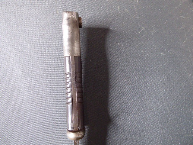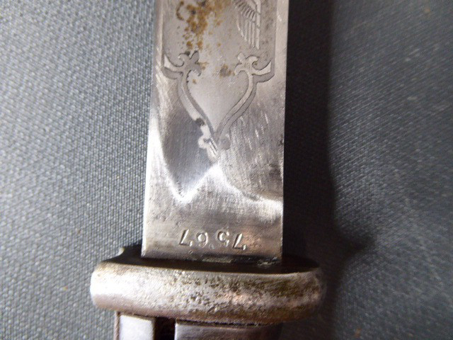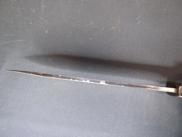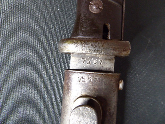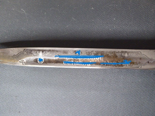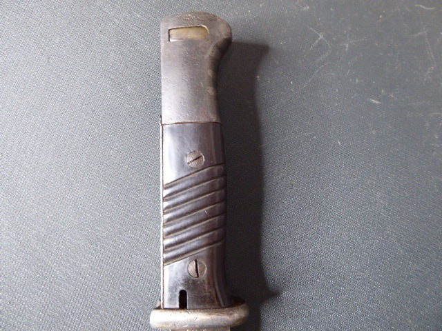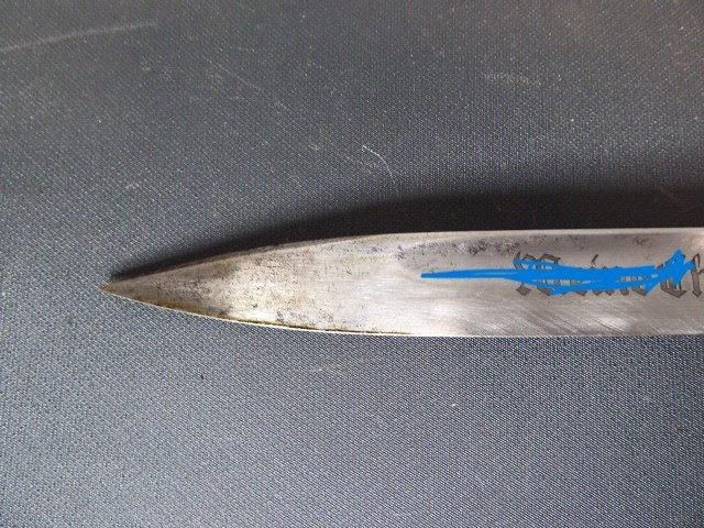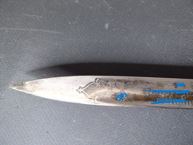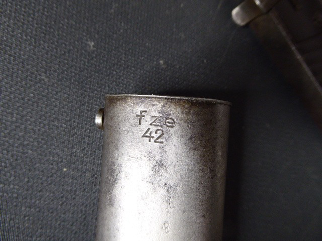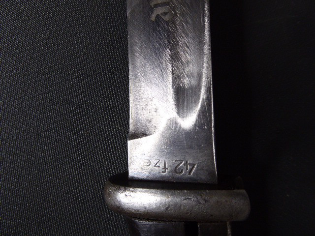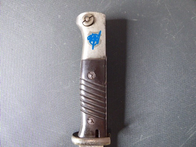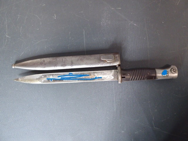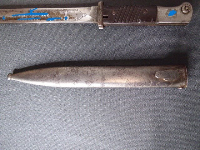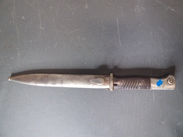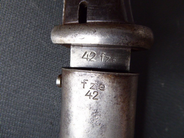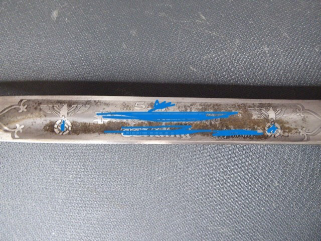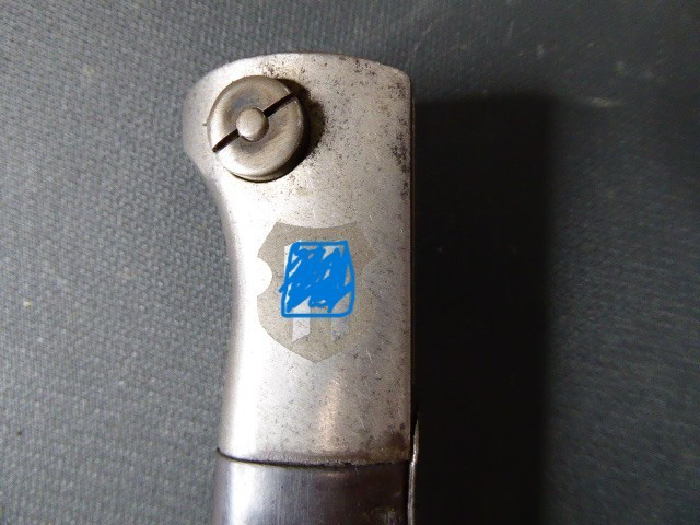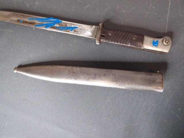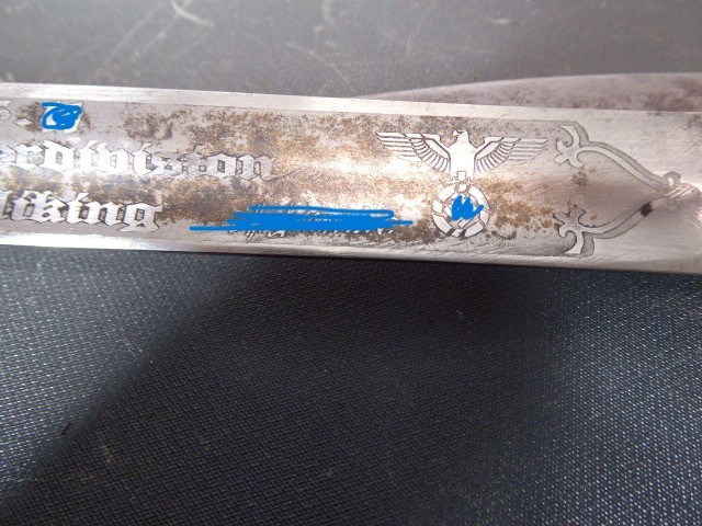 Aus meiner Sammlung gebe ich, ein 94/98 3. Reich Bajo Nummerngleich mit Scheide 7565 Hersteller Code 42 f Ze ab. Griff zwei braune Bakelit Schalen. Griffknauf mit Punze und einseitig XX Ätzung. Klinge beidseitig mit Ätzungen, eine Seite 5 XX Panzerdivision Wiking und Unterschrift, andere Seite mit XX Logo. Klinge auf der Fehlschärfe eine Seite mit Nr. 7565 andere Seite mit Code 42 f Ze, das Gleich ist Identisch auf beiden Seiten der Scheide. Ob die Ätzungen Zeitgenössig sind? kann ich nicht unterscheiden und auch nicht sagen, sieht auf jedenfalls sehr Gut aus, könnte auch original sein? aber das muss jeder für sich entscheiden, die Fotos sind Aussagekräftig genug. Das Teil ist im Guten Sammelwürdigen Zustand. Alles andere entnehmen Sie Bitte den Fotos. Gesamtlänge: 40,5 cm, ohne Scheide: 38,7 cm, Klingenlänge: 25,4 cm, Klingenbreite: 2,5 cm. Kann zu jederzeit bei mir besichtigt werden. Privatauktion keine Rücknahme und Garantie.