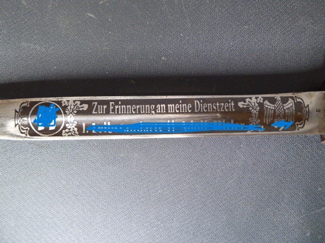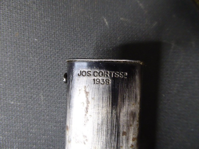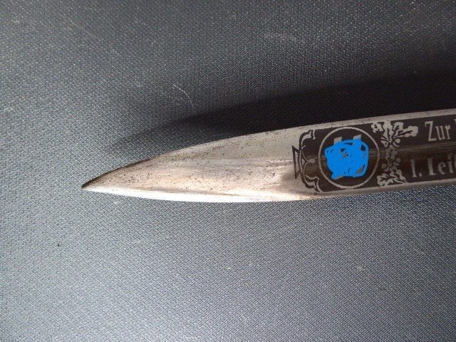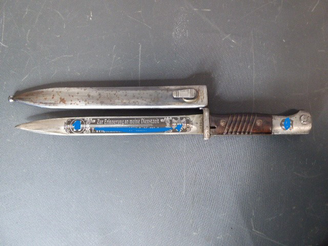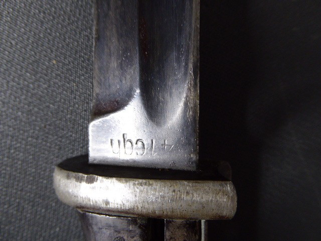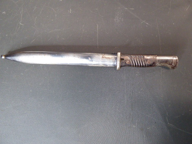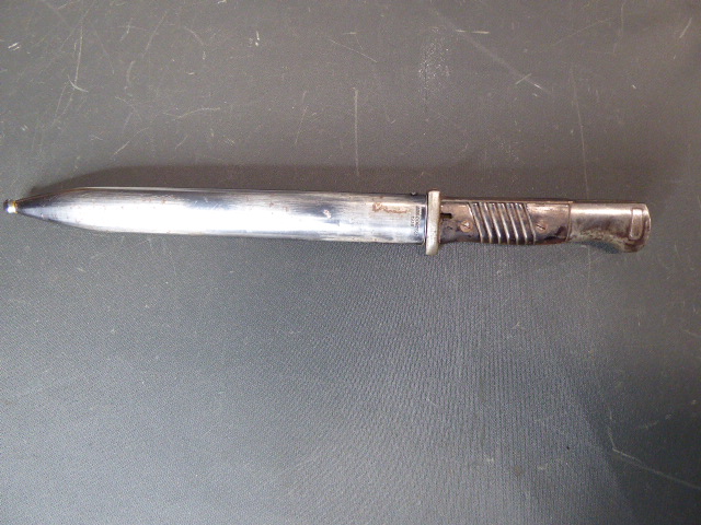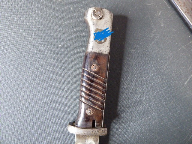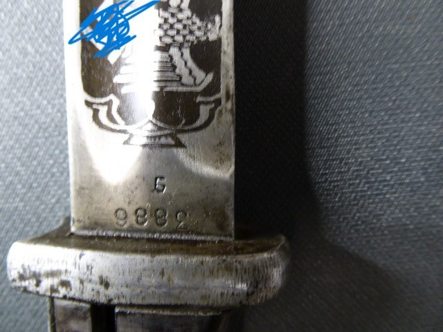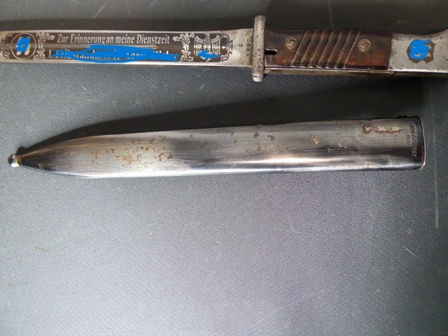 Aus meiner Sammlung gebe ich, ein 94/98 3. Reich Bajo Hersteller Code 41 cqh andere Seite Nr. 3886 g mit Scheide ab. Griff zwei braune Bakelit Schalen. Griffknauf mit Punze und einseitig XX Ätzung. Klinge einseitig mit Ätzungen, zur Erinnerung meiner Dienstzeit. Klinge auf der Fehlschärfe eine Seite mit Nr. 3886 g, andere Seite mit Code 41 cqh. Original brünierte Scheide mit Hersteller JOS CORTSS 1938. Ob die Ätzungen Zeitgenössig sind? kann ich nicht unterscheiden und auch nicht sagen, sieht auf jedenfalls sehr Gut aus, könnte auch original sein? aber das muss jeder für sich entscheiden, die Fotos sind Aussagekräftig genug. Das Teil ist im Guten Sammelwürdigen Zustand. Alles andere entnehmen Sie Bitte den Fotos. Gesamtlänge: 40,6 cm, ohne Scheide: 38,3 cm, Klingenlänge: 25 cm, Klingenbreite: 2,5 cm. Kann zu jederzeit bei mir besichtigt werden. Privatauktion keine Rücknahme und Garantie.