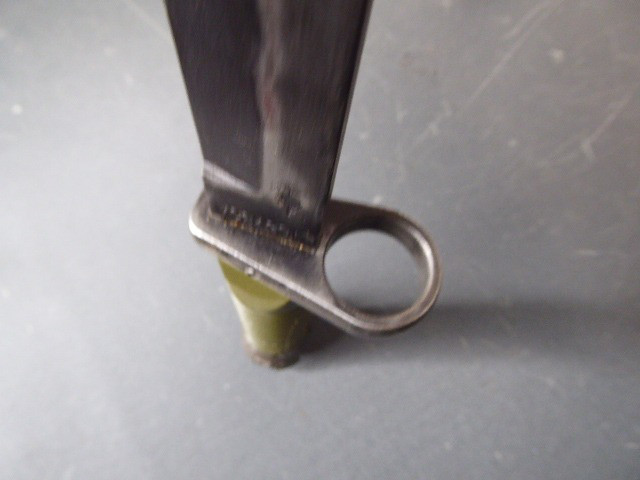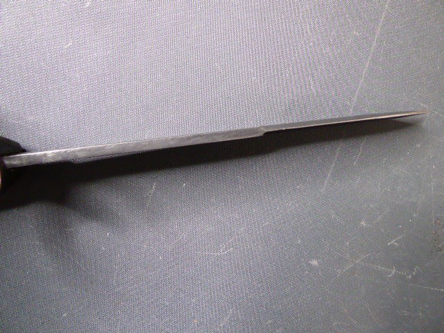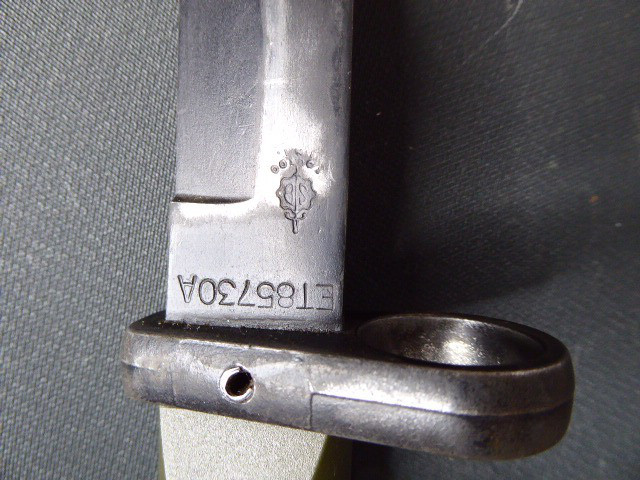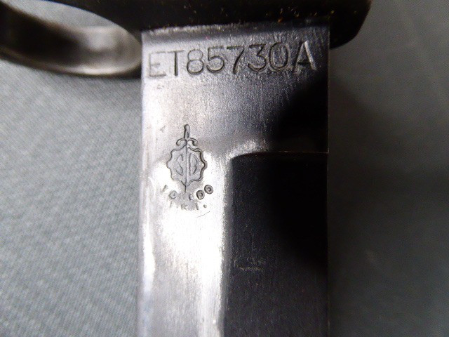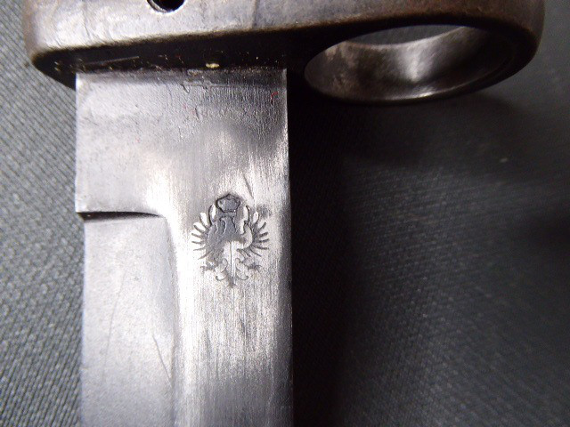 Aus meiner Sammlung gebe ich, ein mir unbekanntes Aufpflanzbares Bajo Klinge mit Adler Punze unter Krone ohne Scheide ab. Kenner werden es sicherlich wissen wo das Teil hingehört. Griff mehrteilig aus Eisen. Klinge einseitig mit Adler Punze unter Krone, andere Seite ET85730A und Punze SB. Das Teil ist im Guten Sammelwürdigen Zustand. Alles andere entnehmen Sie Bitte den Fotos. Gesamtlänge: 35,6 cm, Klingenlänge: 22,5 cm, Klingenbreite: 2,4 cm. Kann zu jederzeit bei mir besichtigt werden. Privatauktion keine Rücknahme und Garantie.