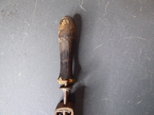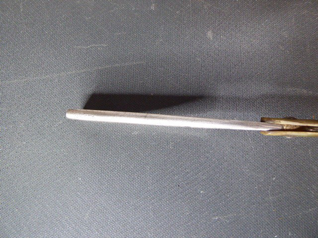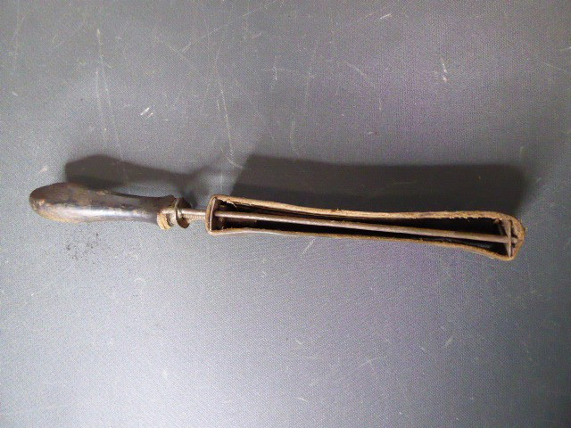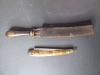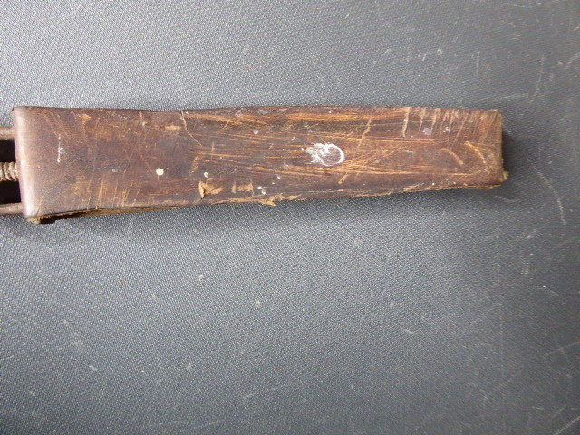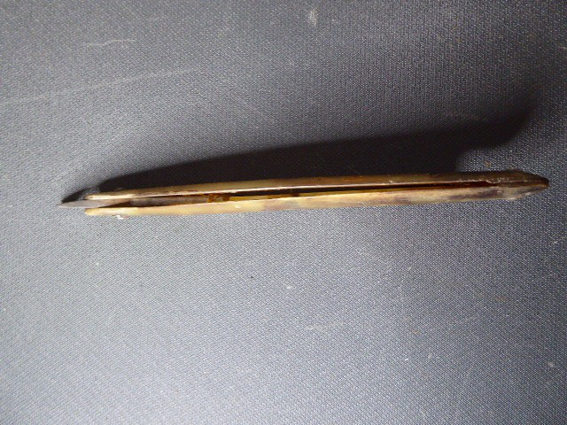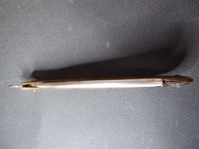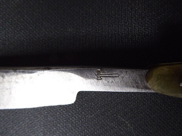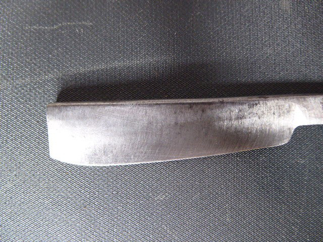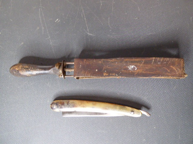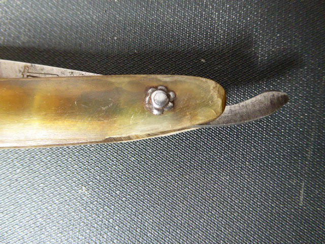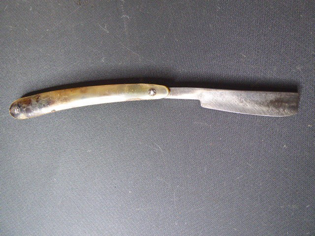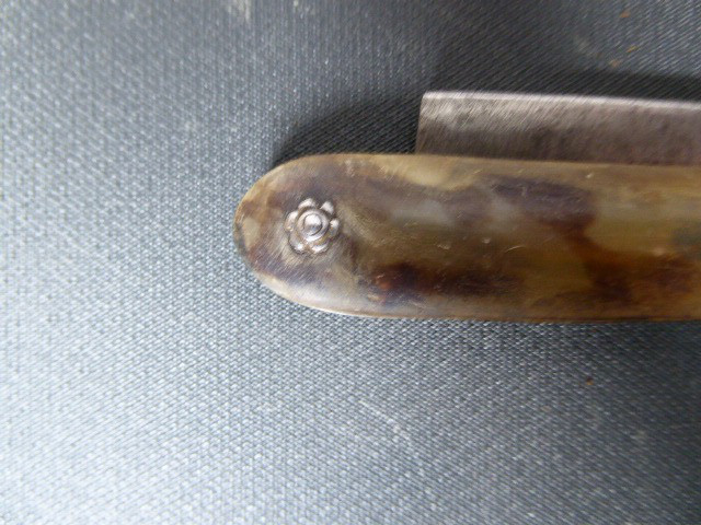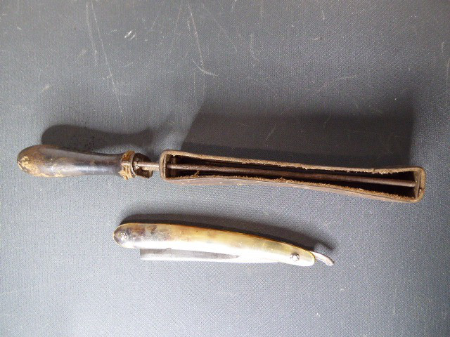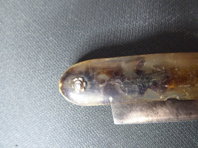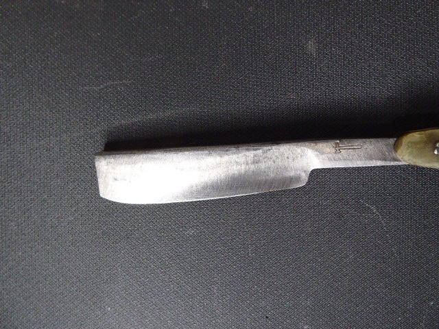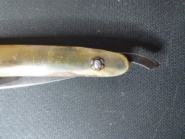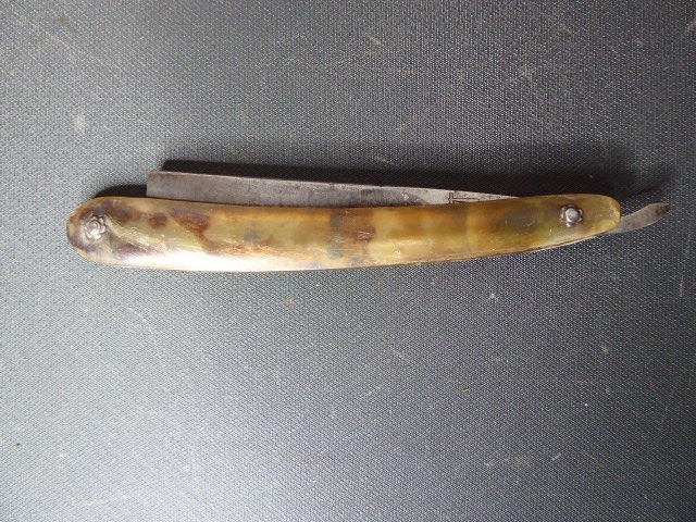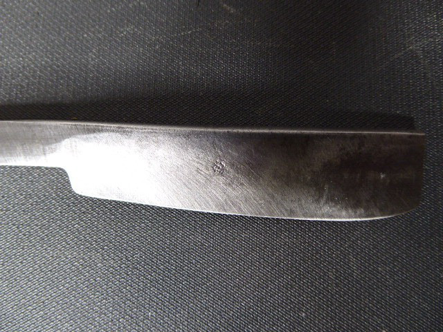 Aus meiner Sammlung gebe ich, ein altes Rasiermesser gestempelt mit Hammer und Punze dazu der Lederschärfer ab. Kenner werden es sicherlich wissen wo das Teil hingehört. Griff zwei Horn Schalen mit Metallrosetten. Einschneidige sehr scharfe Klinge gestempelt mit Hammer und Punze. ist etwas für besondere Sammler. Die Teile brauchten nur mal etwas Pflege, ist aber alles noch Sammelwürdig. Alles andere entnehmen Sie Bitte den Fotos. Gesamtlänge: 20 cm, ohne Scheide: 19,5 cm, Klingenlänge: 9,7 cm, Klingenbreite: 1,9 cm. Kann zu jederzeit bei mir besichtigt werden. Privatauktion keine Rücknahme und Garantie.
