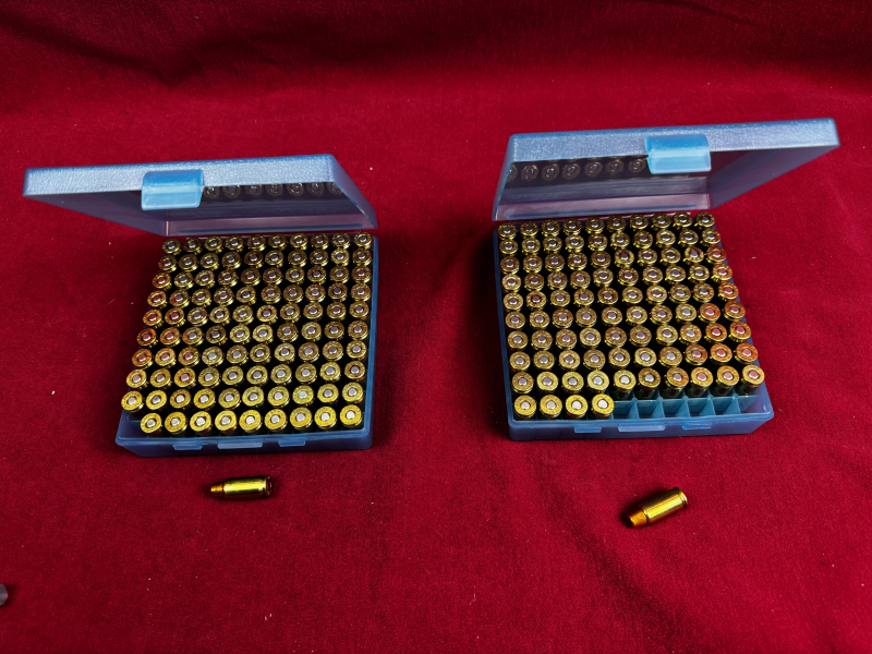 Es handelt sich hier um 195 Schuss, .45Auto, Geschoss H&N: SWC HS, Zünder: Fed. 150, gewerblich wiedergeladenen Munition incl. der MTM Boxen