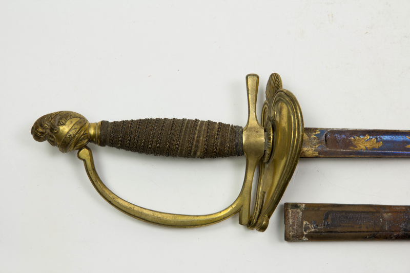 Offiziers-Degen, Frankreich, Empire, vergoldetes Messinggefäß, Drahtwicklung, gebläute Klinge, mit vergoldeten Ornamenten verziert, stark schartige Klinge, gebrochenes Scheide. L: 101 cm.