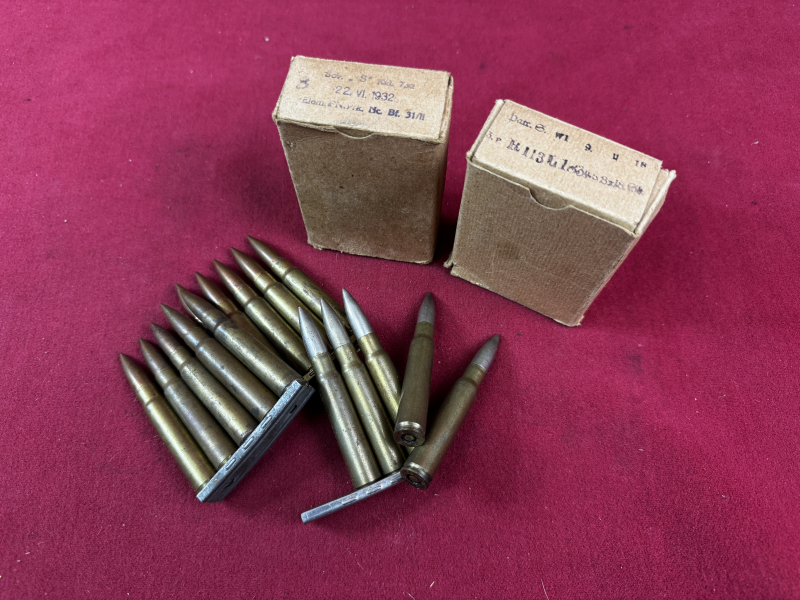 Es handelt sich hier um Munition im Kaliber 7,92 vom 22.VI.1932 in original Verpackung + eine Leerschachtel