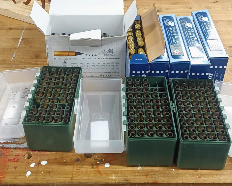 Verkaufe ca. 45 Ppu, 200 Cineshot, 15 Geco, 30 RWS. Alle einmal abgeschossen, die RWS öfters. Die Plastik Boxen sind nicht Bestandteil der Auktion, können jedoch dazu erworben werden. Alle Hüllen Kaliber 7x64.