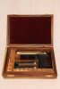 Die Schatulle ist mit bordeauxrotem Samt gepolstert  mit einem Fach für eine Pistole Walther PP sowie zwei Magazinen und 16 Patronen im Kaliber 9 mm PAK.