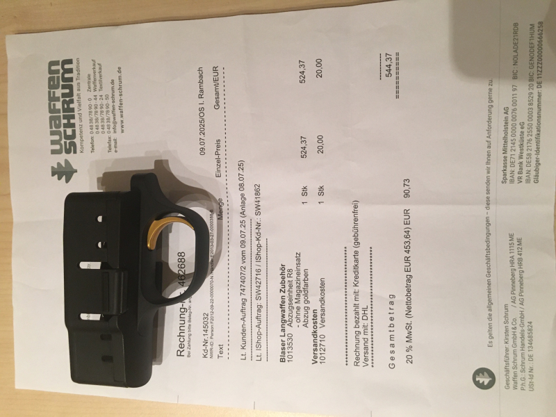 Ungebrauchte Abzugseinheit für Blaser R8 Professional mit vergoldeten Züngel wegen Falschkauf abzugeben.