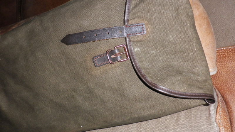 grünes Leinen mit Lederbesatz und Trageriemen