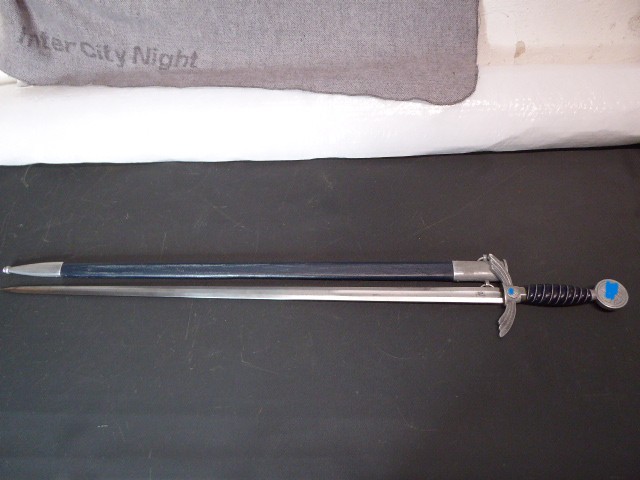 Aus meiner Sammlung gebe ich, ein altes? Luftwaffenschwert Alu Ausführung Hersteller ORIGINAL EICKHORN SOLINGEN mit Scheide ab. Ich kann nicht Genau sagen ob das Teil Zeitgenössig ist oder nicht? Kann es nicht unterscheiden, dafür habe ich zu wenig von solchen Teilen in der Hand gehabt, es sieht aber alles Gut aus. Leder von der Scheide ist wahrscheinlich mal gewechselt worden? aber Kenner werden es sicherlich wissen ob es Zeitgenössig ist oder nicht. Griff Holz mit blauem Leder Ummantelt und Aluminium Drahtwicklung. Parierung und Knauf aus Alu. Zweischneidige Klinge beidseitig mit Kehlungen und Schärfe, auf einer Seite Hersteller ORIGINAL EICKHORN SOLINGEN. Scheide mit blauem Leder ummantelt, Mundblech und Ortblech aus Alu, jeweils mit zwei Schrauben befestigt. Das Teil ist im Guten Sammelwürdigen Zustand. Alles andere entnehmen Sie Bitte den Fotos. Gesamtlänge: 98 cm, ohne Scheide: 96 cm, Klingenlänge: 78 cm, Klingenbreite: 2,5 cm. Kann zu jederzeit bei mir besichtigt werden. Privatauktion keine Rücknahme und Garantie.