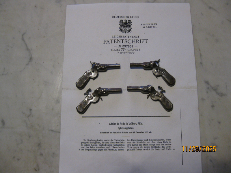 DRP Blättchenpistole aus den 20iger Jahren. Sie bieten auf eine (1x) Pistole mit einer Kopie der Patentschrift und Gebrauchsanweisung. Voll Funktionsfähig. DRP= Deutsches Reichspatent. Gebrauchtware, keine Garantie, kein Umtausch.