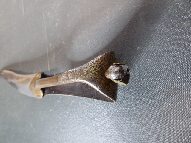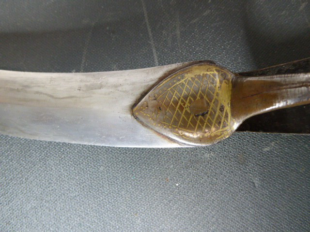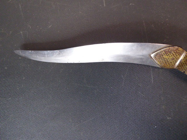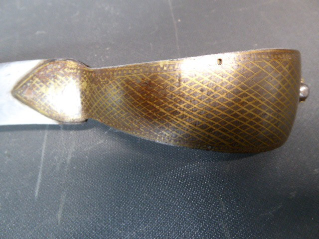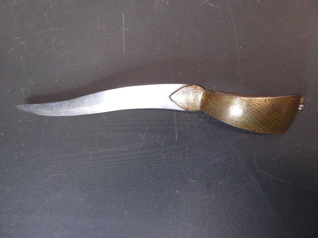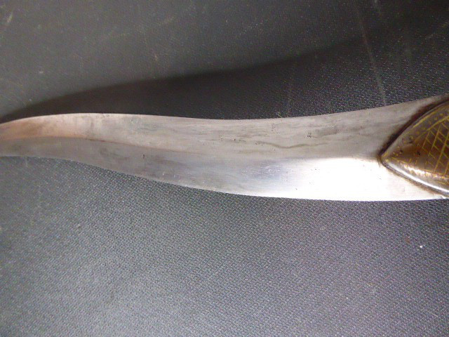 Aus meiner Sammlung gebe ich, ein alten Indischen Dolch (Bichwa) mit Vergoldeten Gefäß ohne Scheide ab. Griff Eisen. Gefäß Vergoldet. Gewällte Stabile Zweischneidige Klinge. Das Teil ist im Guten Sammelwürdigen Zustand. Alles andere entnehmen Sie Bitte den Fotos. Gesamtlänge: 34,5 cm, Klingenlänge: 22,5 cm, Klingenbreite: 3,2 cm. Kann zu jederzeit bei mir besichtigt werden. Privatauktion keine Rücknahme und Garantie.