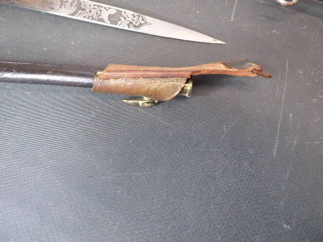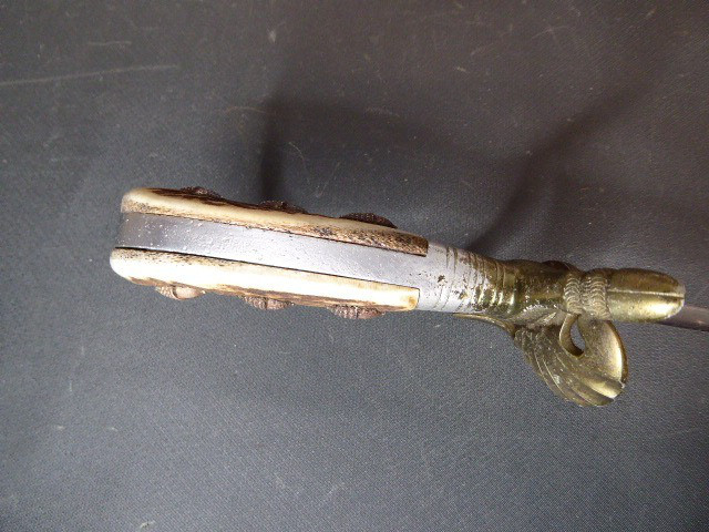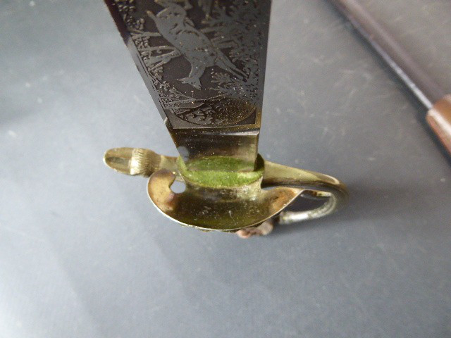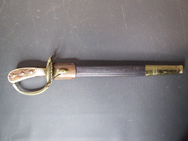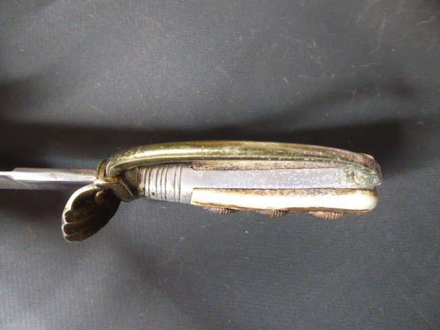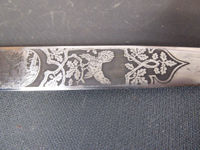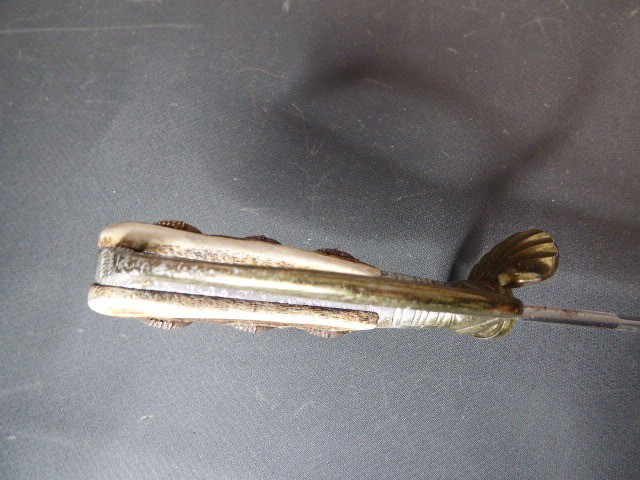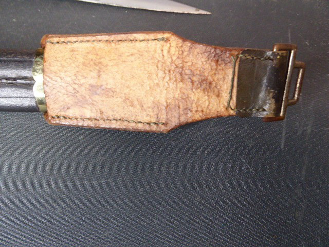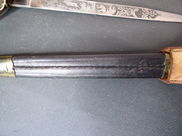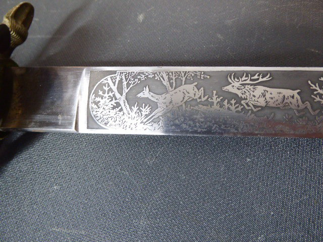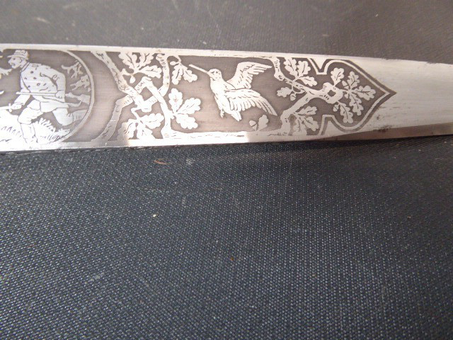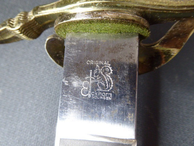 Aus meiner Sammlung gebe ich, ein alten 3. Reich Hirschfänger mit Scheide und Trageschuh Herst. ORIGINAL EIKHORN SOLINGEN ab. Griff zwei Hirschhornschalen, beidseitig mit drei Eicheln. Gefäßteile aus Alu die Vergoldung ist Teilweise Verschlissen. Einschneidige Klinge, beidseitig mit Jagdlichen Motiven geätzt, einseitig auf der Fehlschärfe, Hersteller ORIGINAL EIKHORN SOLINGEN. Scheide Leder mit zwei Vergoldeten Beschlägen. Das Stück ist im Guten Sammelwürdigen Zustand. Alles andere entnehmen Sie Bitte den Fotos. Gesamtlänge: 47,5 cm, ohne Scheide: 45,5 cm, Klingenlänge: 33 cm, Klingenbreite: 2,8 cm. Kann zu jederzeit bei mir besichtigt werden. Privatauktion keine Rücknahme und Garantie.