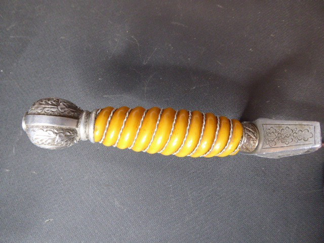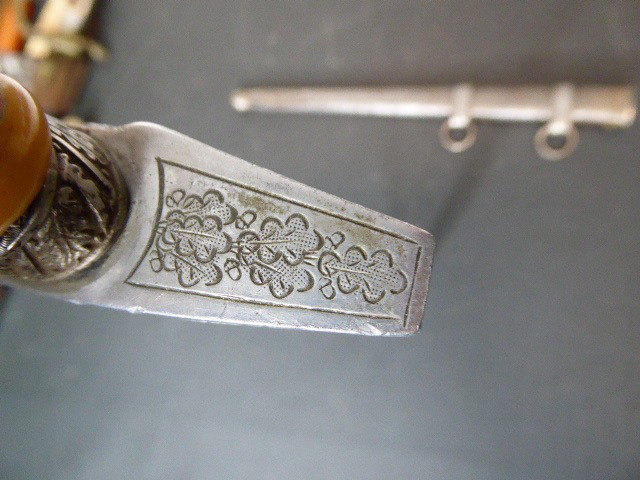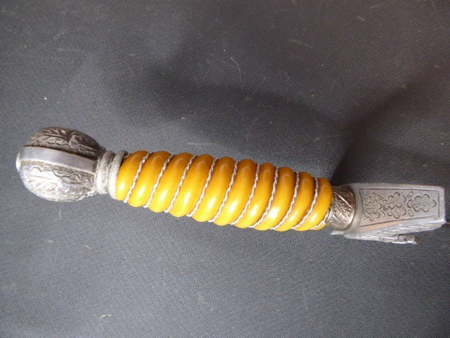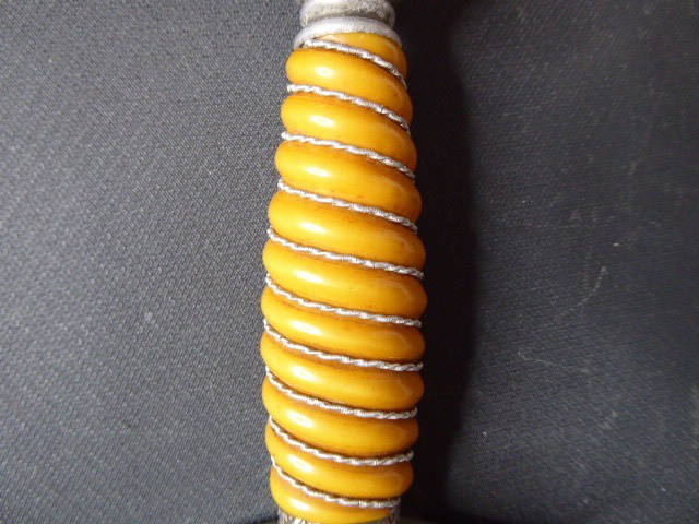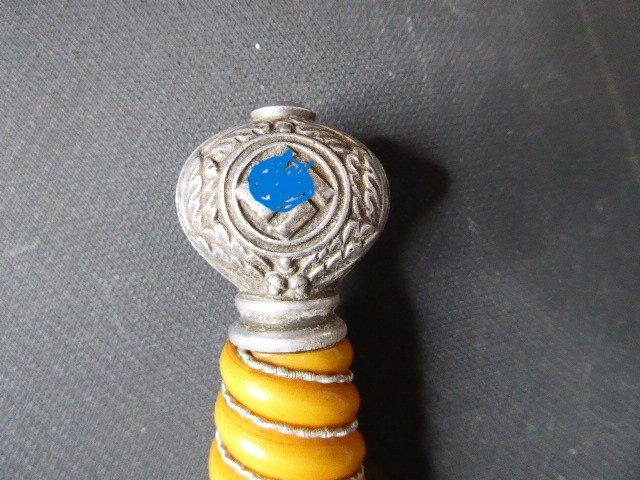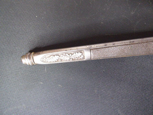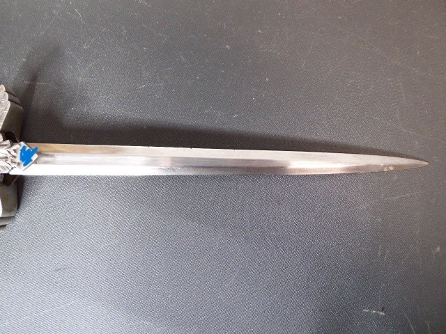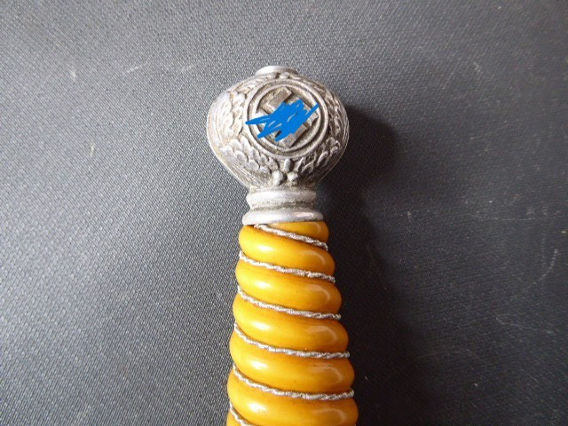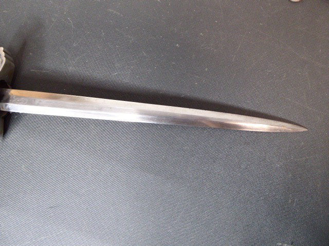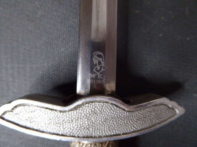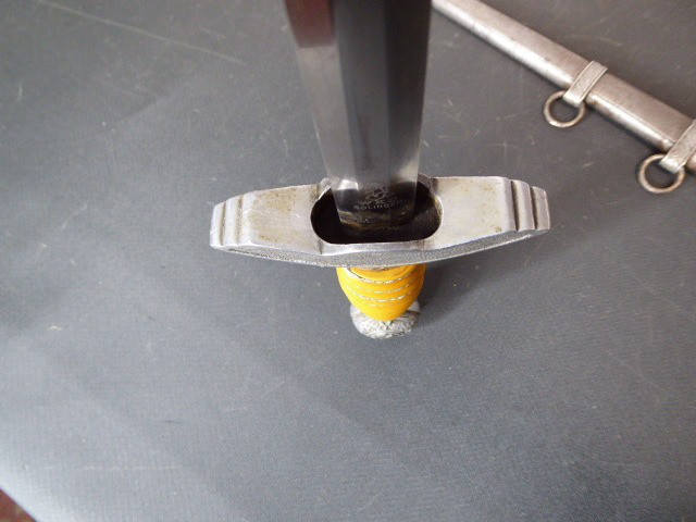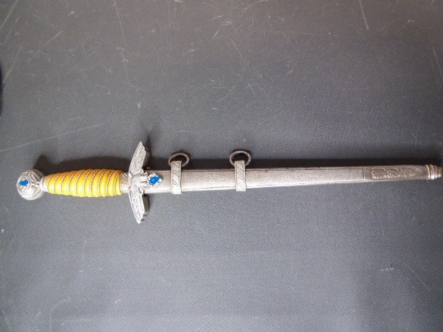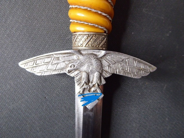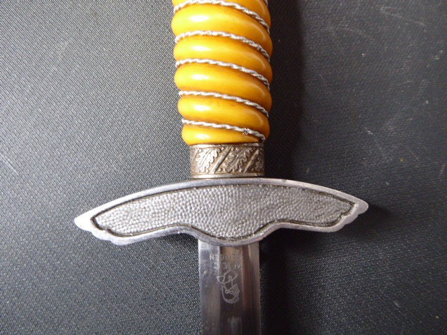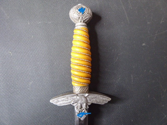 Aus meiner Sammlung gebe ich, ein alten Luftwaffen Dolch Hersteller WKC SOLINGEN mit Scheide ab. Gelblicher Griff 100% Original, mit gedrillter Aluminium Draht Wicklung. Gefäßteile Aluminium. Zweischneidige Klinge auf der Fehlschärfe, Hersteller WKC SOLINGEN. Scheide Magnetisch mit zwei Trageringe. Das Stück ist im Guten Sammelwürdigen Zustand. Alles andere entnehmen Sie Bitte den Fotos. Kann zu jederzeit bei mir besichtigt werden. Privatauktion keine Rücknahme und Garantie.