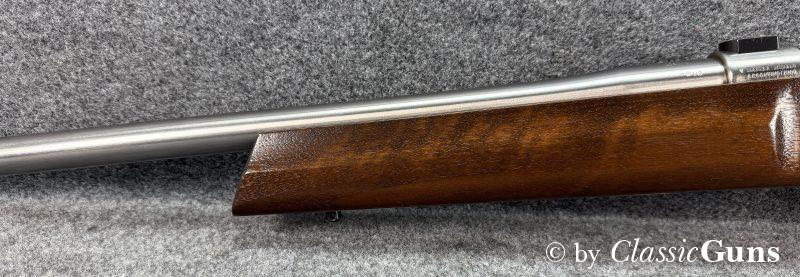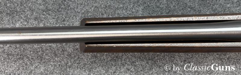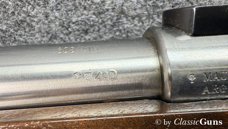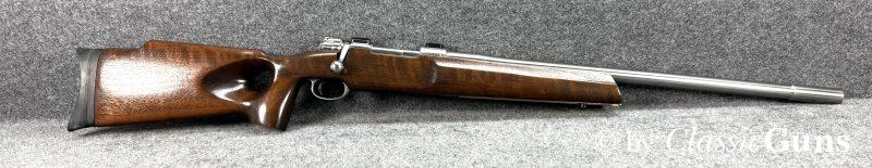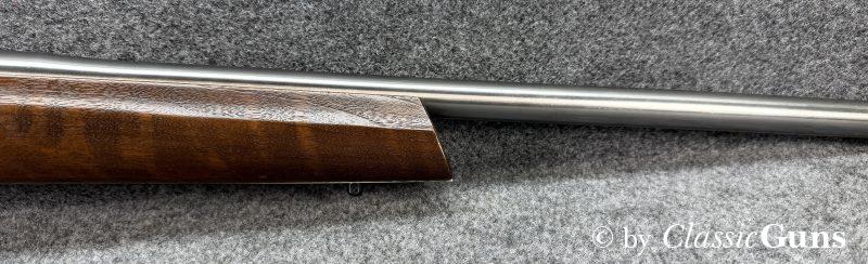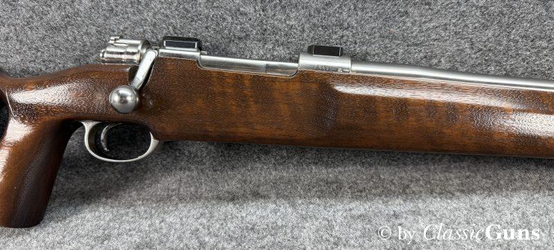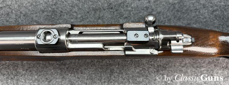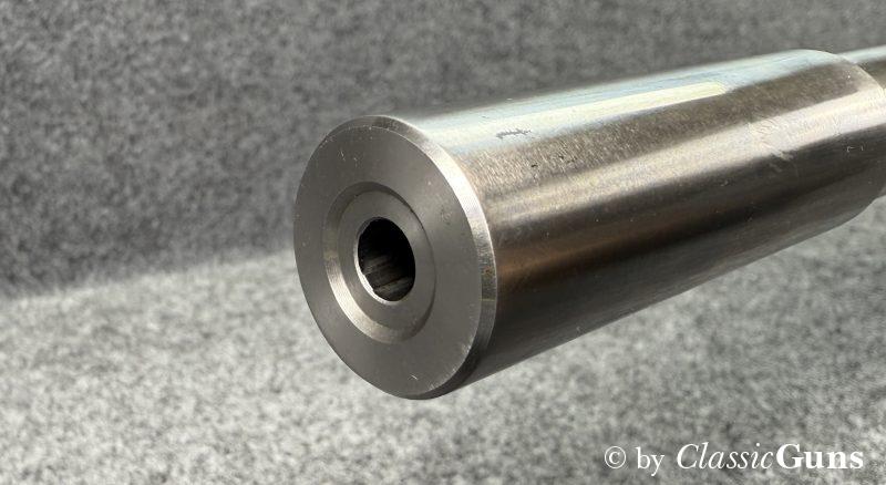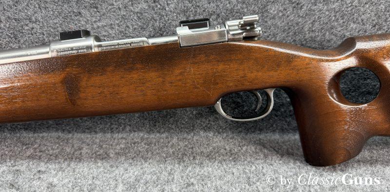 650 mm langer Matchlauf aus Edelstahl und mit neuwertigem Zug-/ Feldprofil. Blank poliertes System aus erstklassiger DWM-Fertigung (Argentinien M 1909). Sehr guter Nussbaum Lochschaft mit perfekter Bettung. Bewährter Timney Matchabzug, Mittelschaftmagazin mit Klappdeckel und einer Kapazität von fünf Patronen.