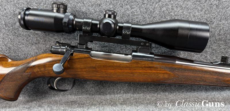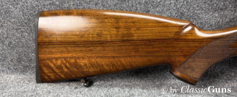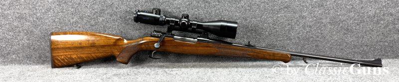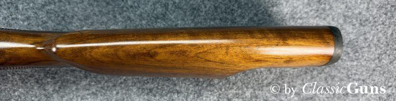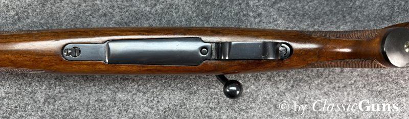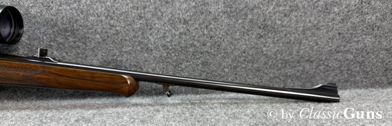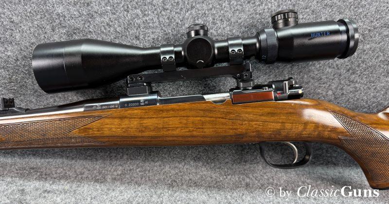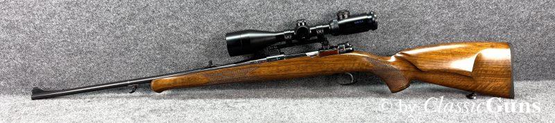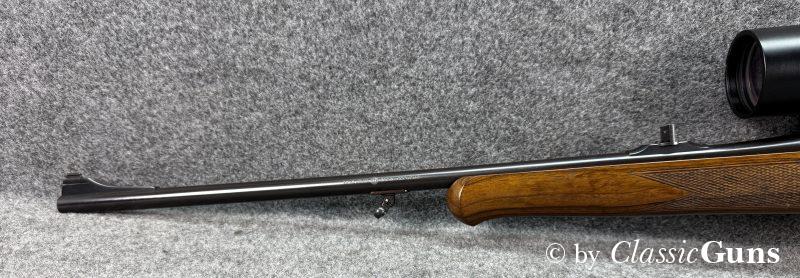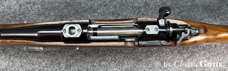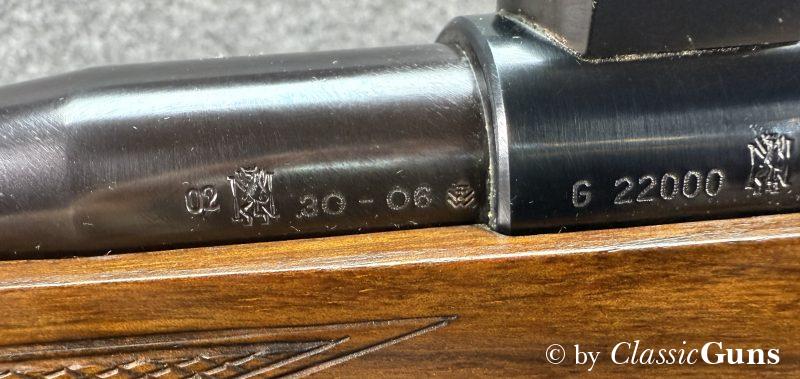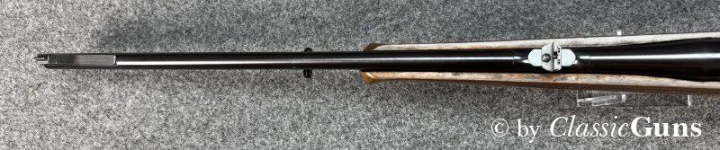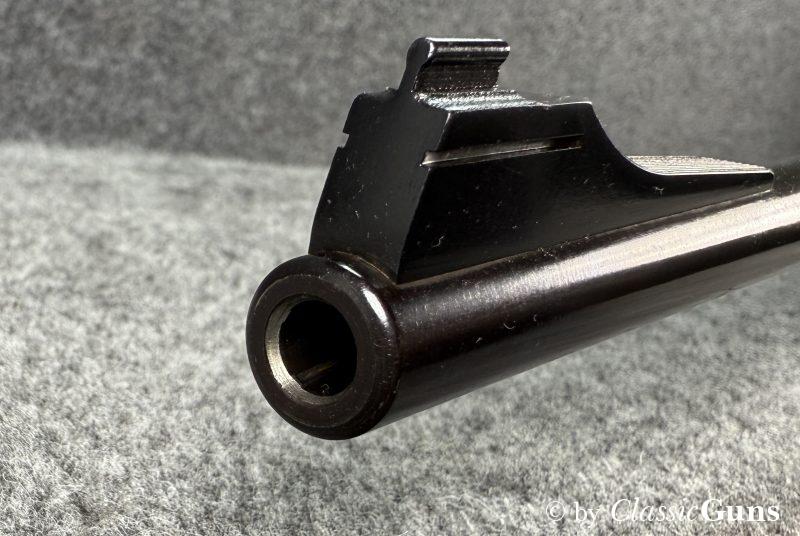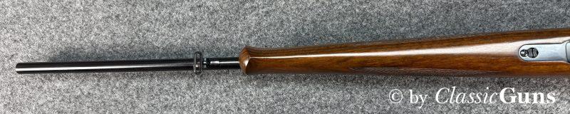 600 mm langer Lauf mit erstklassigem Zug-/ Feldprofil. Erstklassig erhaltene Brünierung sowie erstklassig erhaltener Nussbaumschaft mit sehr schöner Holzmaserung und bayrischer Backe. Praxistauglicher Kombiabzug mit Rückstecher, Mittelschaftmagazin für fünf Patronen.