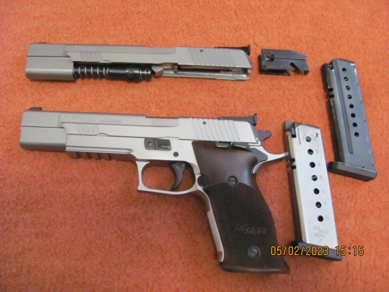Zur Waffe gehören jeweils zwei Magazine( 45 ACP 8 Schuß,9mm 10 Schuß. Die Fotos zeigen die Waffe mit aufgesetztem Wechselsystem 9mm.Beim Wechsel 45ACP/9mm und umgedreht ist zu beachten, das der Verriegelungsblock jeweils ausgetauscht werden muß. Wechsel auf 45 ACP geht immer sehr schnell, umgedreht manchmal etwas fummelig. Mittlerweile soll es einen Verriegelungsblock für beide Systeme geben, ca.300,-Kosten.Dann kann man sich den Tausch sparen.