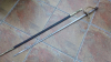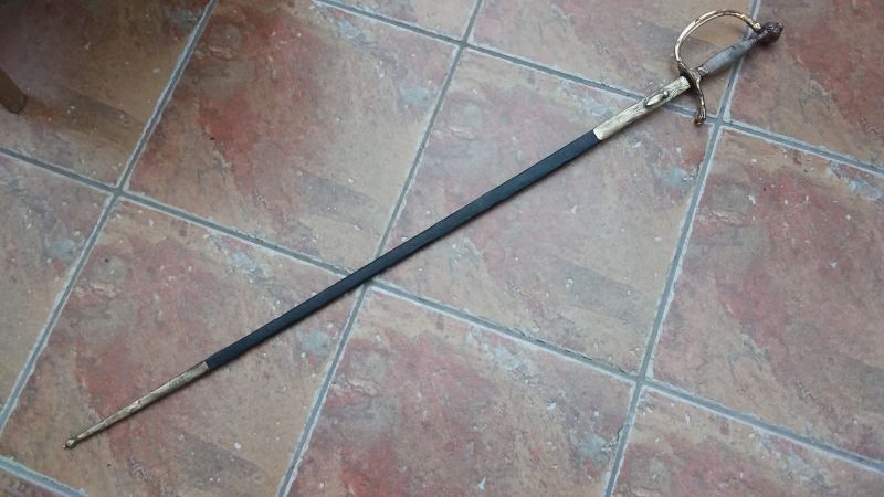 Schlanker Galanteriedegen mit Scheide ( Metall mit Leder bespannt),Beschläge und Griffbügel Messing etwas fleckig- kann sicherlich verbessert werden. Griffwicklung ( Silberdraht ? )fest auch etwas fleckig. Gesamtlänge ca. 100 cm. Klinge auf einer Seite kleine Roststellen.