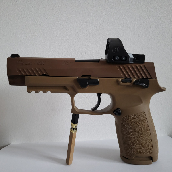 Die P320 M17 von Sig Sauer ist eine moderne hochentwickelte Selbstladepistole mit einem Polymer-Griffmodul auf robustem Edelstahlrahmen, basierend auf die Auslieferung der M17 für die US-Streitkräfte. Langlebige Coyote PVD-Beschichtung zeichnen diese 9 mm-Pistole aus. Ein präziser Carbon-Stahllauf, Strike-Fire Abzug, manuelle Flügelsicherung, M1913 Picatinny-Schiene.