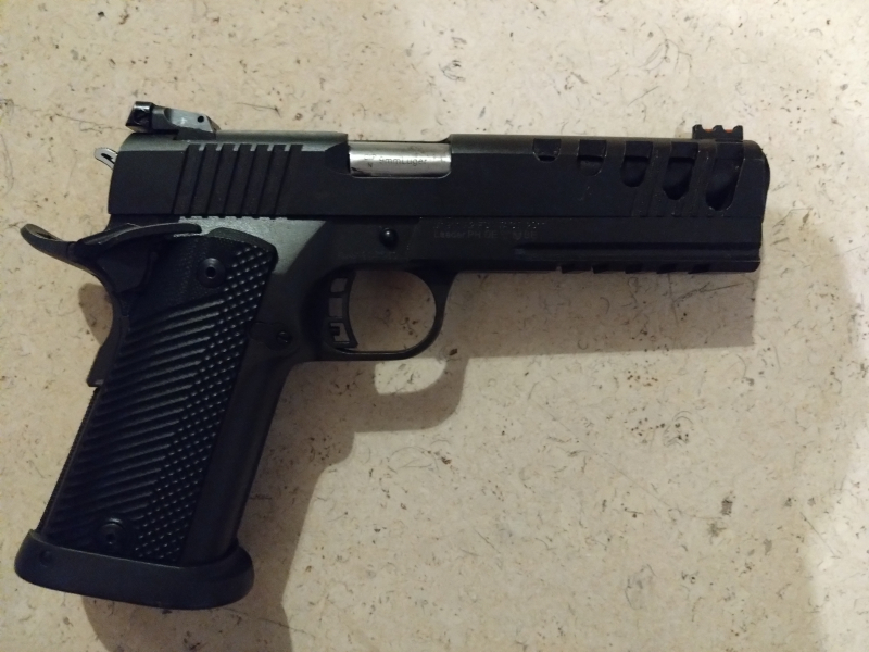 Verkaufe Pistole Armscore Tactical, Modell 2011 in 9mm. Waffe wurde auf den Jagdschein erworben. Keine 50 Schuss, Waffe wurde nie geführt. Neuwertiger Zustand. Von Werk hat die Waffe einen gefrästen Schlitten, um das Gewicht zu reduzieren. Jetfunnel für schnellen Magazinwechsel, inkl. 5 Magazine a 18 Patronen. Waffe im System 1911. Einstellbarer Abzug und skelettierter Hammer.