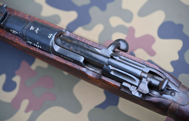 Herstellerlogo „jhv“ und Jahreszahl „44“ oben auf der Hülse, linksseitig "G98/40“, viele „WaA“-Stempel auf Lauf und Hülse ("Adler über 173", "Adler über HK").