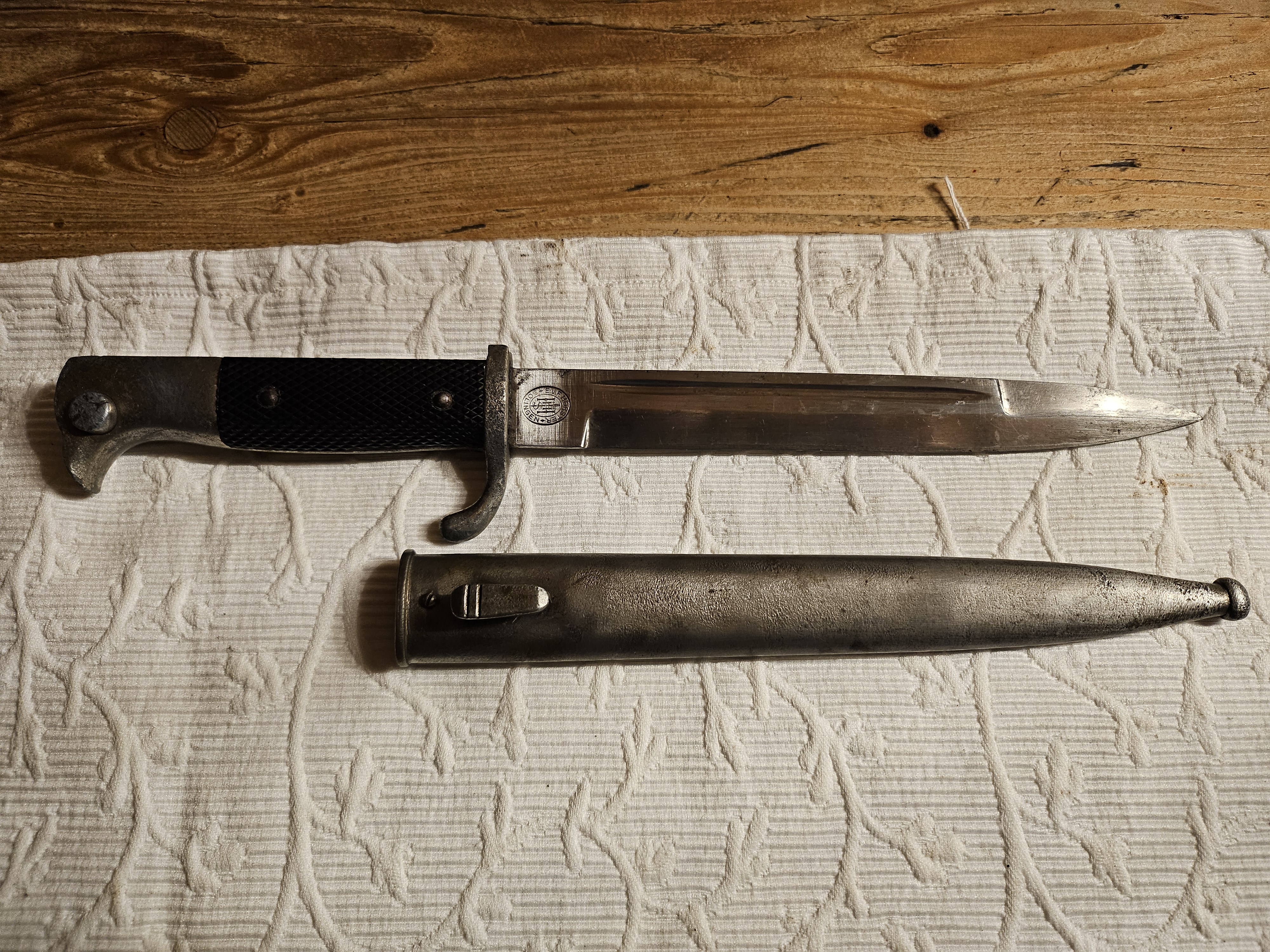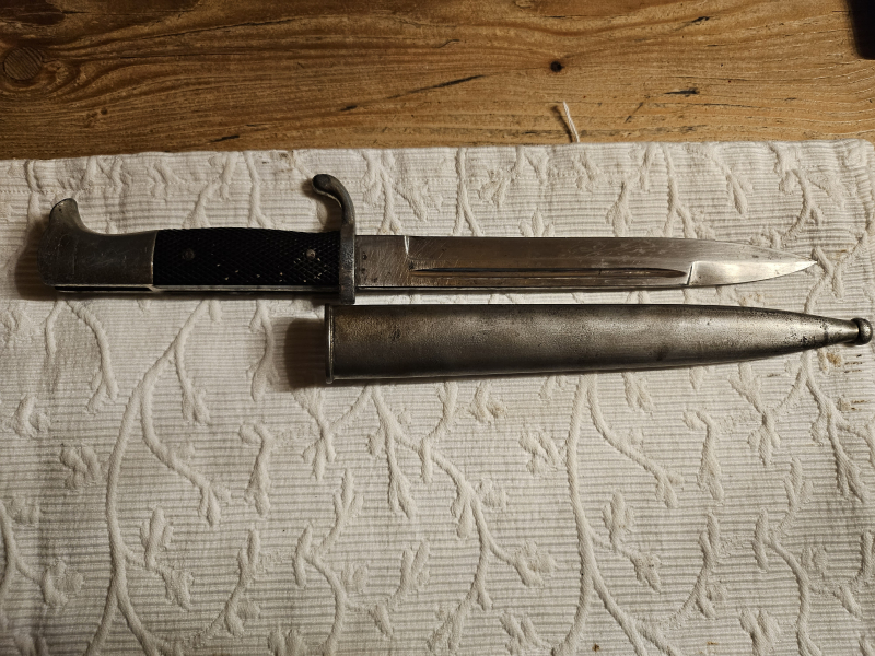 Zur Versteigerung kommt ein schönes AUSGEH/PARADESEITENGEWEHR der Fa. HÖRSTER, Solingen mit Emblem ; original 2. WK. Es ist aufpflanzbar für den Karabiner 98 k. In der Aufpflanzvorrichtung noch der originale rote Filzstreifen vorhanden. Drücker leicht gängig. Klinge gekehlt und in hervorragendem Zustand - siehe Bilder. Im Fundzustand nach Hausräumung belassen.