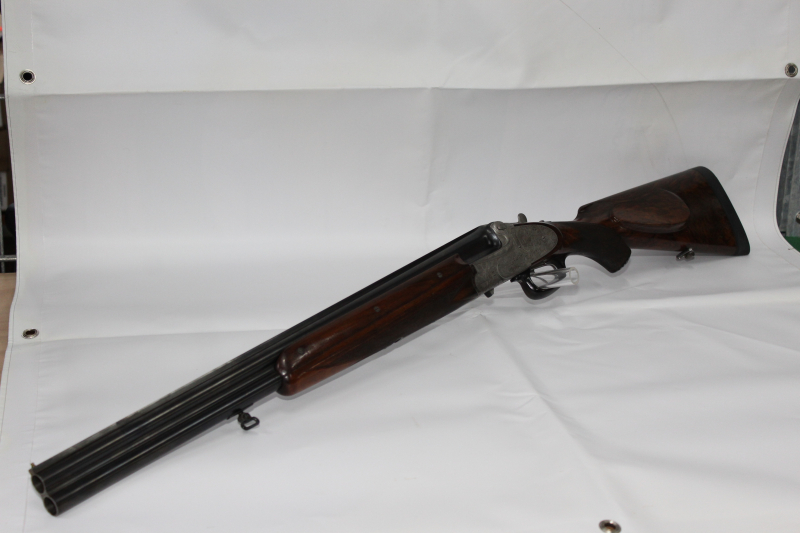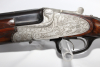 Meisterarbeit aus ehemaligen Adelsbesitz: Bockdoppelflinte "Waffen Roedl München" (auf Laufschiene). Österreichischer Beschuß von 1955 (521.55). Ferlacher Hersteller? Kal.16/70. Lauflänge (nur) 60cm. Mit Chokelehre gemessen beide Läufe gleich und Vollchoke. Schaftlänge 37,5cm. Lange, sehr schön gravierte Seitenplatten. Doppelgreenerverschluß mit doppelten Laufhaken - dicht und gut ziehend. Läufe innen/Brünierung sehr gut. Holz (Top Qualität) mit Gebrauchsspuren aber ohne Ausbrüche oder Risse. Böhler Antinit Laufstahl. 6mm guillochierte Schiene. Ejektor, geteilter Vorderschaft, Hornpistolengriffkäppchen und Hornabzugsbügel. Vorderer Abzug mit Gelenk. Insgesamt ein sauber gearbeitetes Top-Stück. Keine Merkel, Heym, Krieghoff, Suhler Waffenwerke, Browning oder Bühag. Gebrauchtware (Differenzbesteuert) - Gewährleistung auf ein Jahr verkürzt gem. Paragraph 476 Abs.2 BGB. AGBs sind Bestandteil des Kaufvertrags. Versand (ausschließlich per Spedition eigenhändig - auch an andere Händler - für 40.- EUR Versandkostenanteil) zahlt Käufer, Abholung möglich. International bidders are welcom if they have a german dealer partner who will take the gun for export.