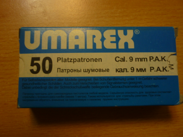 Aus meiner Sammlung eine Schachtel mit 50 Platzpatronen cal. 9mm P.A.K., selten gewordene Sammlermunition aus älterer Fertigung. Messinghülse mit UMA gestempelt. Mein Gun beachten.