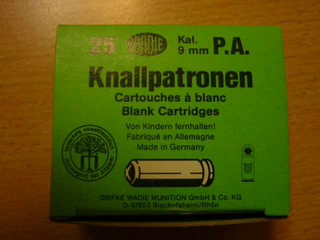 Aus meiner Sammlung eine Schachtel mit 25 Platzpatronen cal.9mm P.A. Wadie, Sammlermunition in der alten grünen Schachtel, die Munition stammt aus den Anfängen des Kaliber 9mm P.A. (das K ist erst später dazu gekommen) , dieses Päckchen dürfte so von um 1995 oder älter sein. Mein Gun beachten.