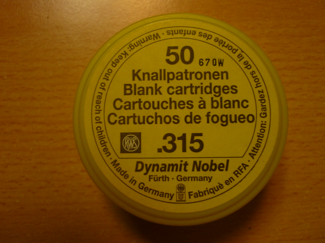 Aus meiner Sammlung eine Dose mit 50 RWS Platzpatronen cal. 315 in der gelben Dose , Messinghülse mit RWS gestempelt , sehr selten gewordene Sammlermunition. Mein Gun beachten.