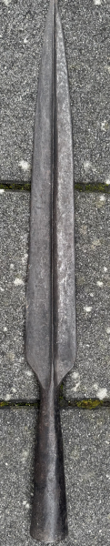 Aus Schmiedeeisen gefertigt, mit blattförmigem, einseitig gekehltem Pikeblatt und konischer Tülle. Ohne Punzen.