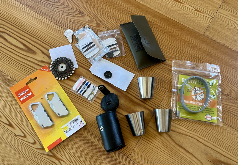 Drei Stamperl aus Niro mit Tragehülke, stark wirksames Insektenschutzarmband (noch verpackt), zahlenschlösser für Reisetaschen und Rucksäcke oder Gewehrtaschen, Bundesheernähzeug mit wasserdichter Tasche..