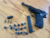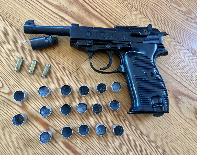 P38 Schreckschusspistole aus Vollmetall, Marke Brand Bruni BBM ME 38 P mit einigen Schiessbechern und Knallpatronen, abschraubbarer Schussbecher, made in Italy, 8mm..